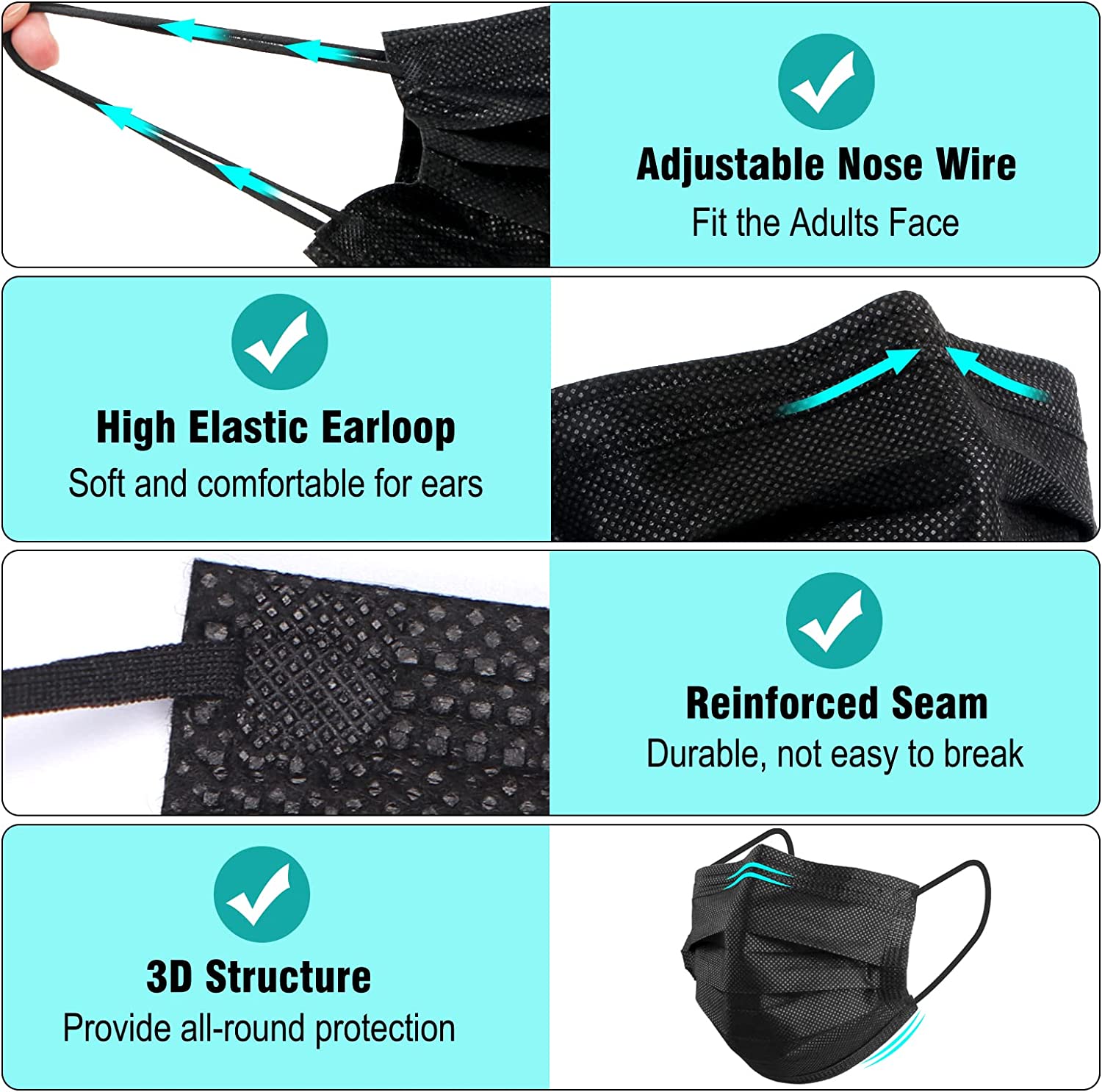 100 Pack Disposable Face Masks, 3 Ply Filter Protection Black Disposable Face Masks