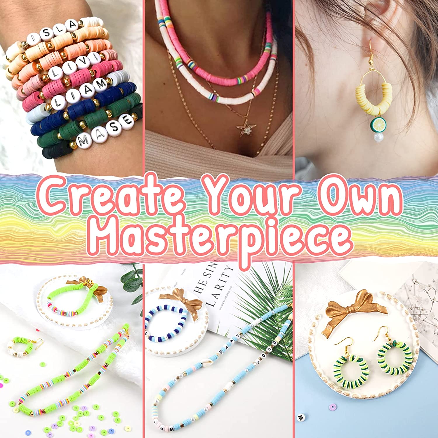 5000Pcs Clay Beads for Bracelets Making Kit, Flat Preppy Heishi Beads Polymer Clay Beads with Letter Beads, Pendant Charms and Elastic Strings for Jewelry Making Kit Bracelet Necklace Gift for Girls