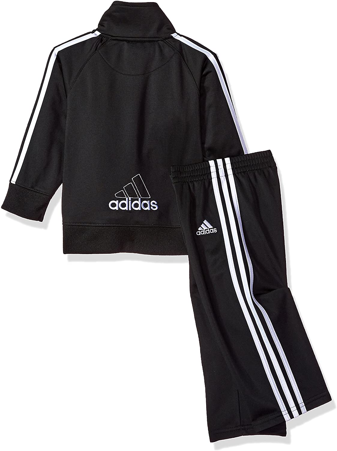 Full zip raglan jacket with dazzle applied stripes. Embroidered Adidas brand mark on left chest. Elastic waist pant with dazzle applied stripes. Embroidered Adidas brand mark. Durable Product.