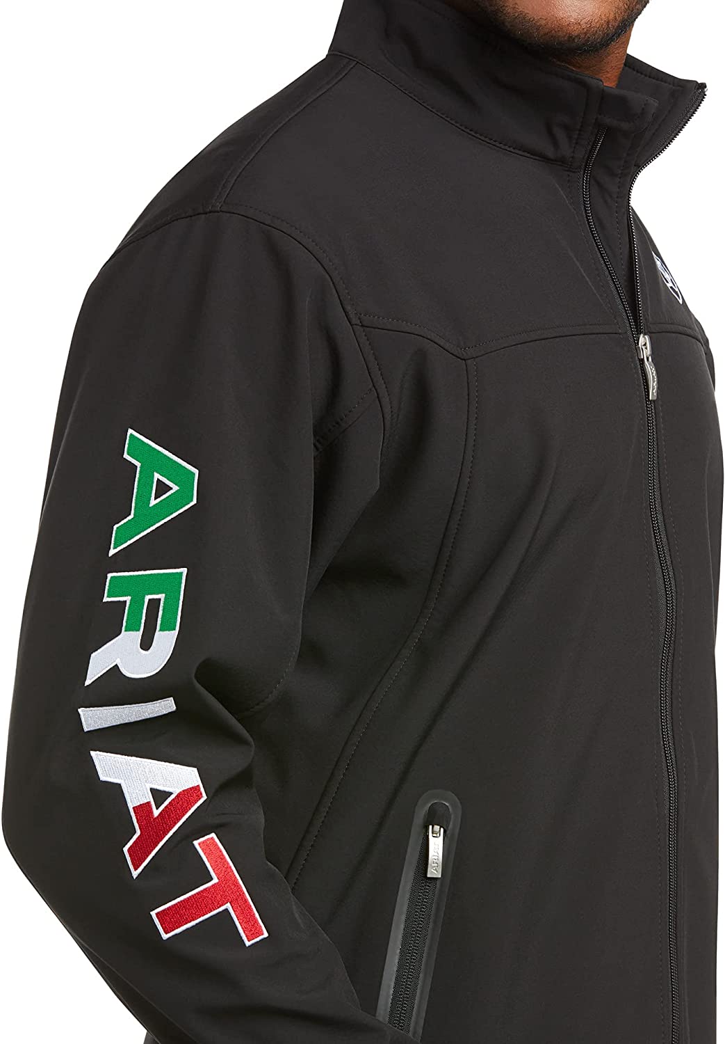 New Team Softshell MEXICO Water Resistant JacketOur smart, sleek Team Softshell Jacket is for the athlete who demands the best. It's warm to the core and cut to perfection so you'll always ride in supreme comfort. This exclusive style pays tribute to Mexico. AriatTEK Cold Series technology keeps body core warm Wind and water resistant garments employ a thin technological coating to block wind and protect from light rain Softshell with microfleece backing Team color blocking Stand collar Zippered hand pockets Ariat branding