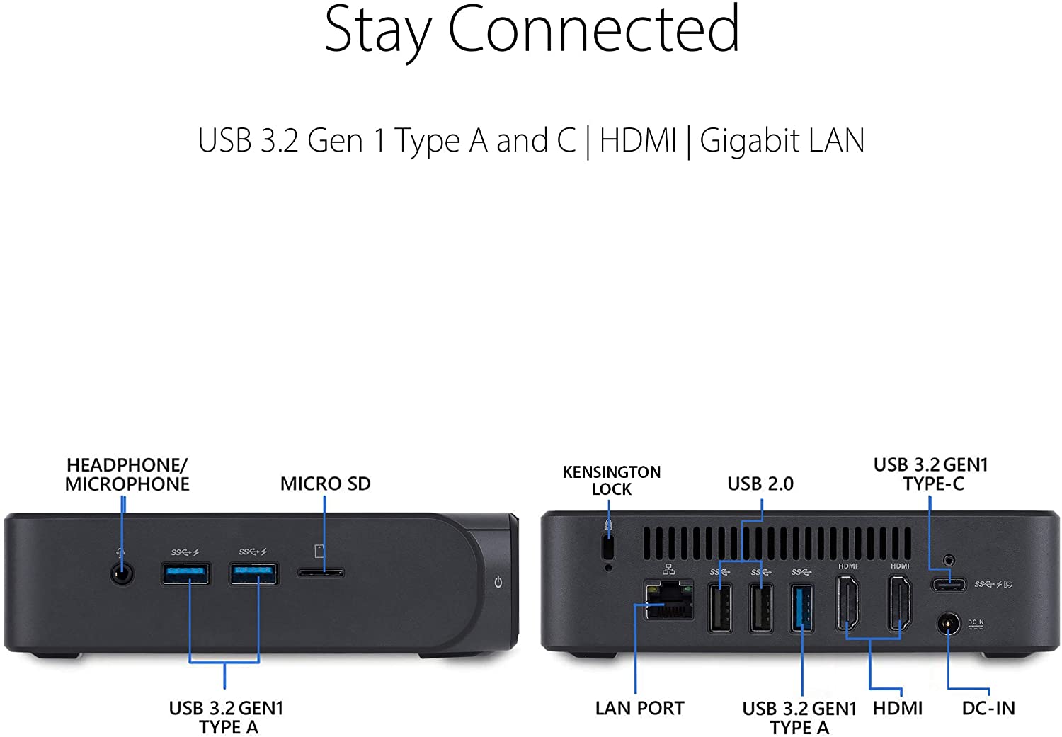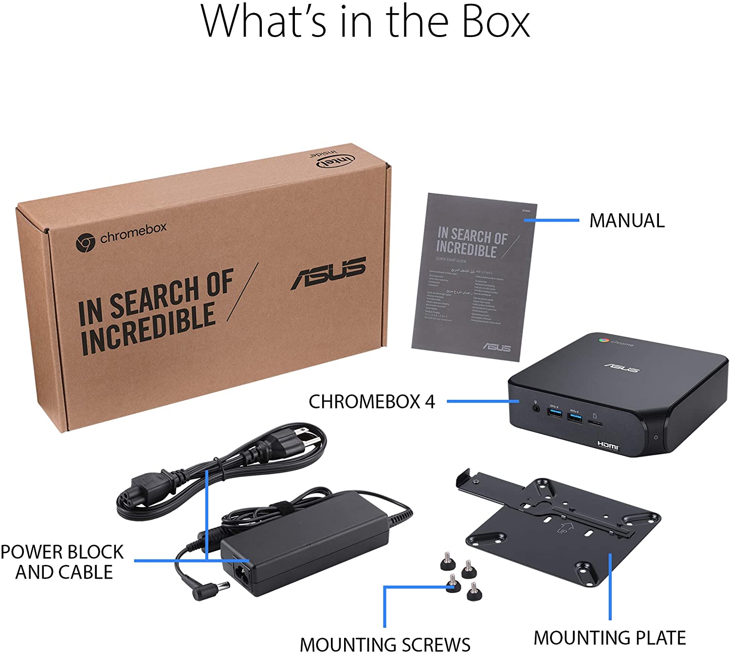 ASUS Chromebox 4 with Intel® Celeron, 4GB RAM, 32GB eMMC storage, Power/DisplayPort Over Type C, Dual HDMI, Gigabit LAN, WiFi 6, USB 3.2, MicroSD Card Reader, VESA Mount, Chrome OS