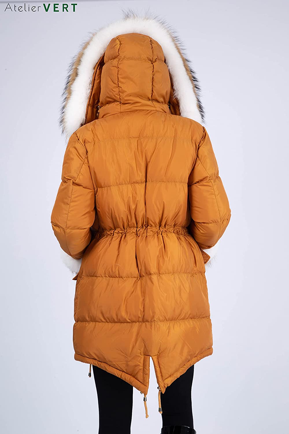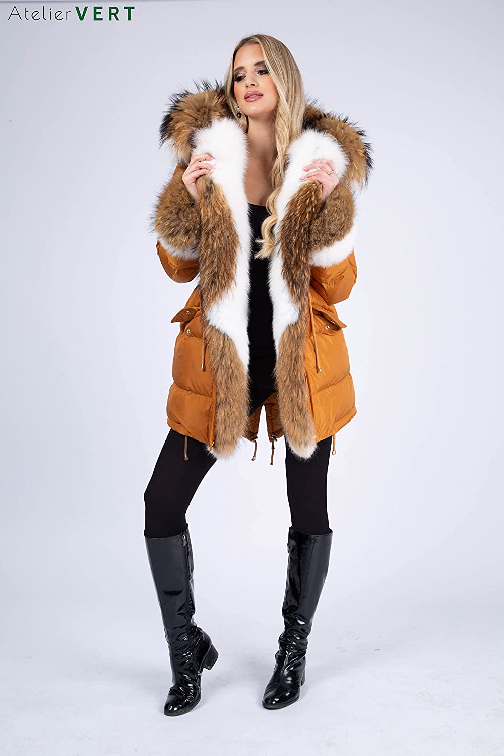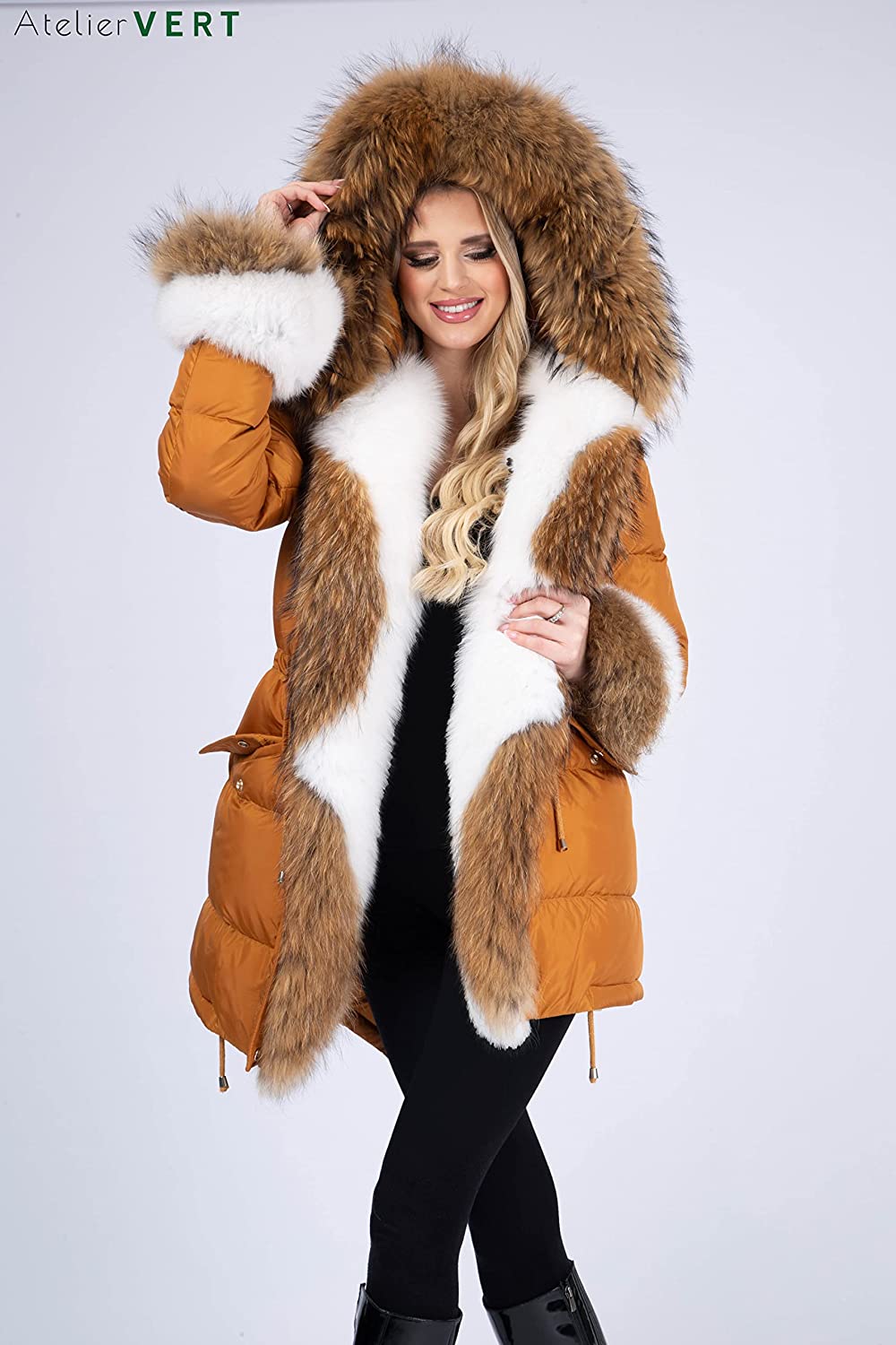 AtelierVert, Women's Inflatable Fox Raccoon Fur Detailed Parka, Women's Fox Fur Parka, Stylish and Luxury Design ATV-105