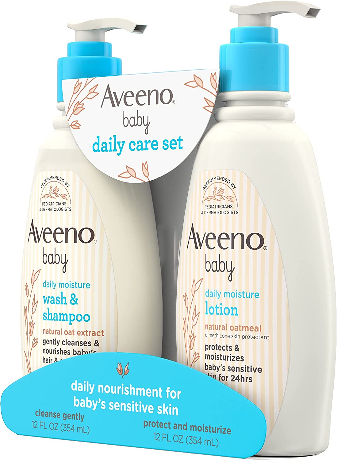 Aveeno Baby Daily Care Gift Set features a gentle 2-in-1 cleansing baby wash & shampoo and a daily moisturizing baby body lotion specially designed for baby's delicate skin. The Aveeno Baby Wash & Shampoo with natural oat extract is a gentle, yet rich lathering bath wash designed for tear-free cleansing of both sensitive skin and hair. The hypoallergenic tear-free formula is pH-balanced and free of soap, sulfates, parabens, phthalates and phenoxyethanol. It rinses clean, leaving a soft, fresh fragrance. After bathing, soothe and moisturize baby's skin with Aveeno Baby Daily Moisture Body Lotion. Containing natural oatmeal blended with dimethicone skin protectant, the fragrance-free lotion formula nourishes and helps protect baby's delicate skin. The non-greasy formula absorbs quickly and moisturizes for a full 24 hours. Plus, the hypoallergenic lotion is free of parabens, phthalates, steroids and phenoxyethanol. Aveeno is a pediatrician and dermatologist recommended brand.