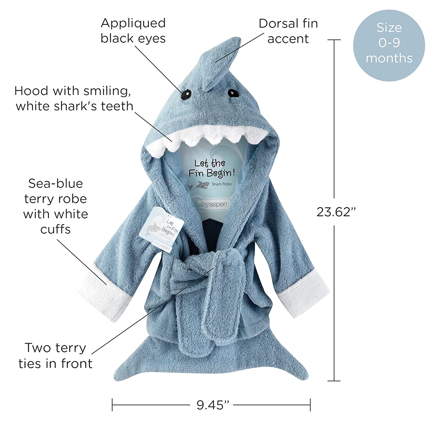 Features and facts: ""Let the Fin Begin"" Terry Shark Robe blue terry robe with white cuffs, two terry ties in front, a hood with smiling, white shark's teeth, appliqued black eyes and a dorsal fin accent. Sharks Machine-wash and dry (low). Size 0-9 months.
