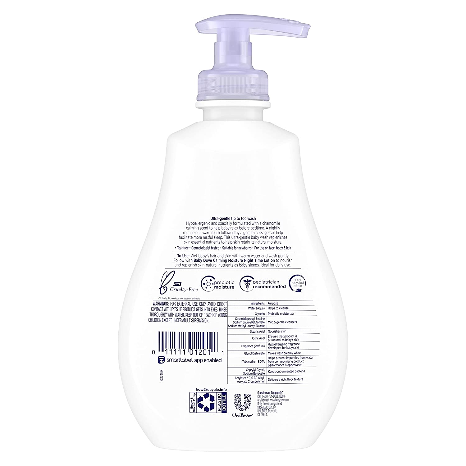 Looking for ways to help your baby sleep through the night? For experts and real parents, the key is sticking to a routine. A warm bath followed by a gentle massage can be key to your baby's sleep routine. That's why we formulated Baby Dove Calming Moisture Hypoallergenic Baby Wash with a soothing scent to help baby wind down at bedtime while nourishing their delicate skin. Baby bath time is a good time to start getting your little one ready for bed. And with a calming chamomile scent, this gentle baby wash is the perfect addition to baby’s nighttime bath. Tear-free and hypoallergenic, it goes beyond mildness to cleanse and care for baby’s delicate skin. This soothing baby bath wash is made with 100 percent skin-natural nutrients, which are identical to those naturally found in skin, and prebiotic moisture to help replenish the essential moisture and nutrients that baby’s skin can lose during bath time. And our caring baby wash and shampoo formula is created without dyes, parabens, phthalates, or sulfates and safety-tested and pediatrician recommended. With a rich and creamy lather, this baby wash leaves your little one feeling clean, soft, and ready for bed. And then hopefully you’ll be able to relax too, rather than wondering how to put a baby to sleep. We know there’s no right or wrong way to be a parent – only your way. That’s why Baby Dove is here to help give you confidence that you’re providing the best skin care for your baby's skin. Our Calming Moisture Hypoallergenic Baby Wash is sold in 13 oz. And 20 oz. bottles. Looking for something for extra sensitive skin. Look for Baby Dove Fragrance-Free Moisture Hypoallergenic Wash.