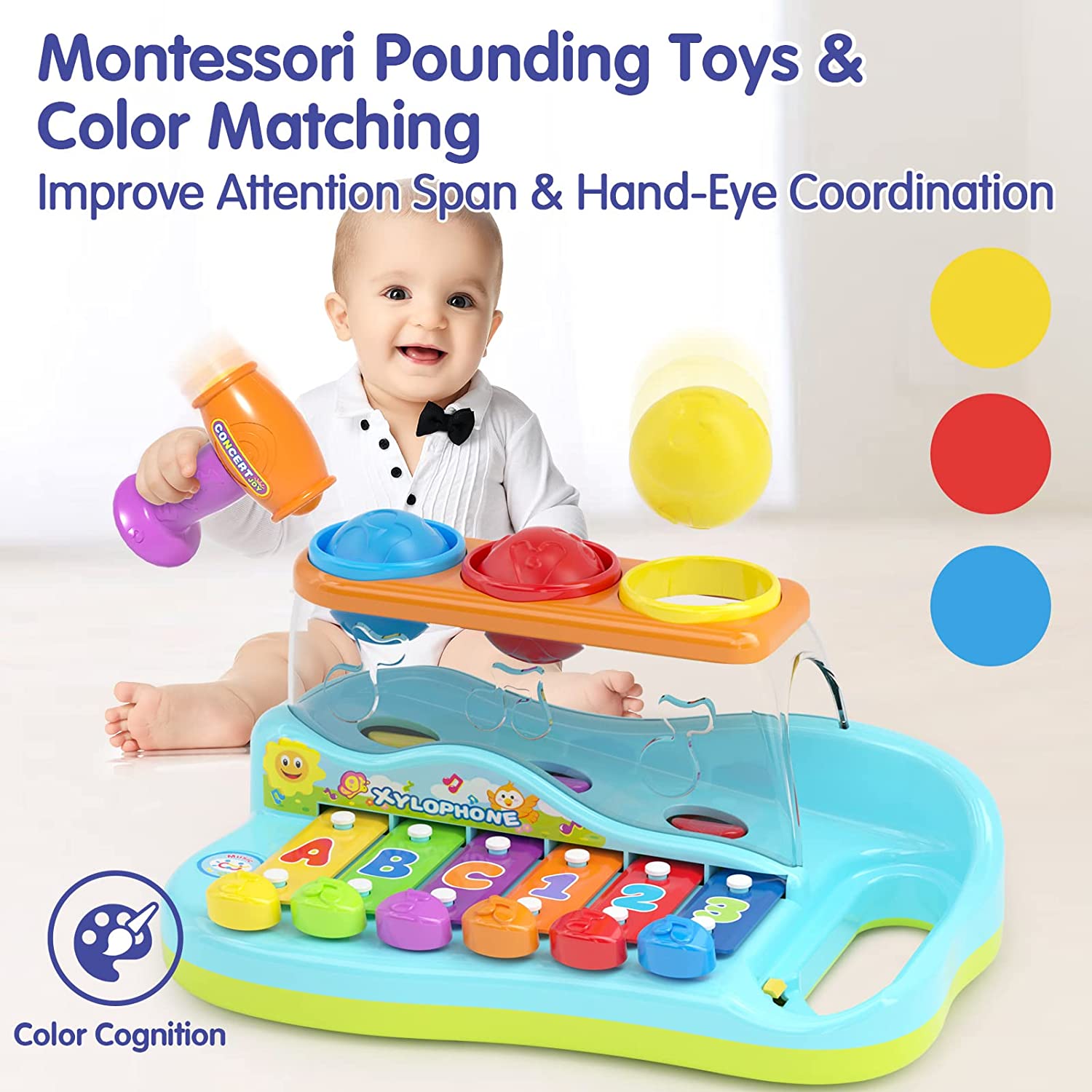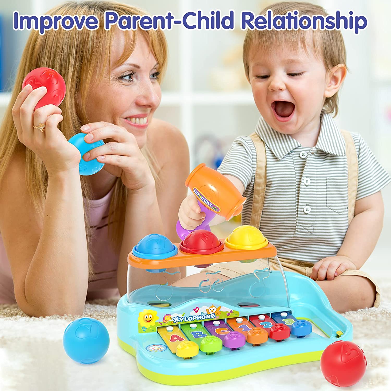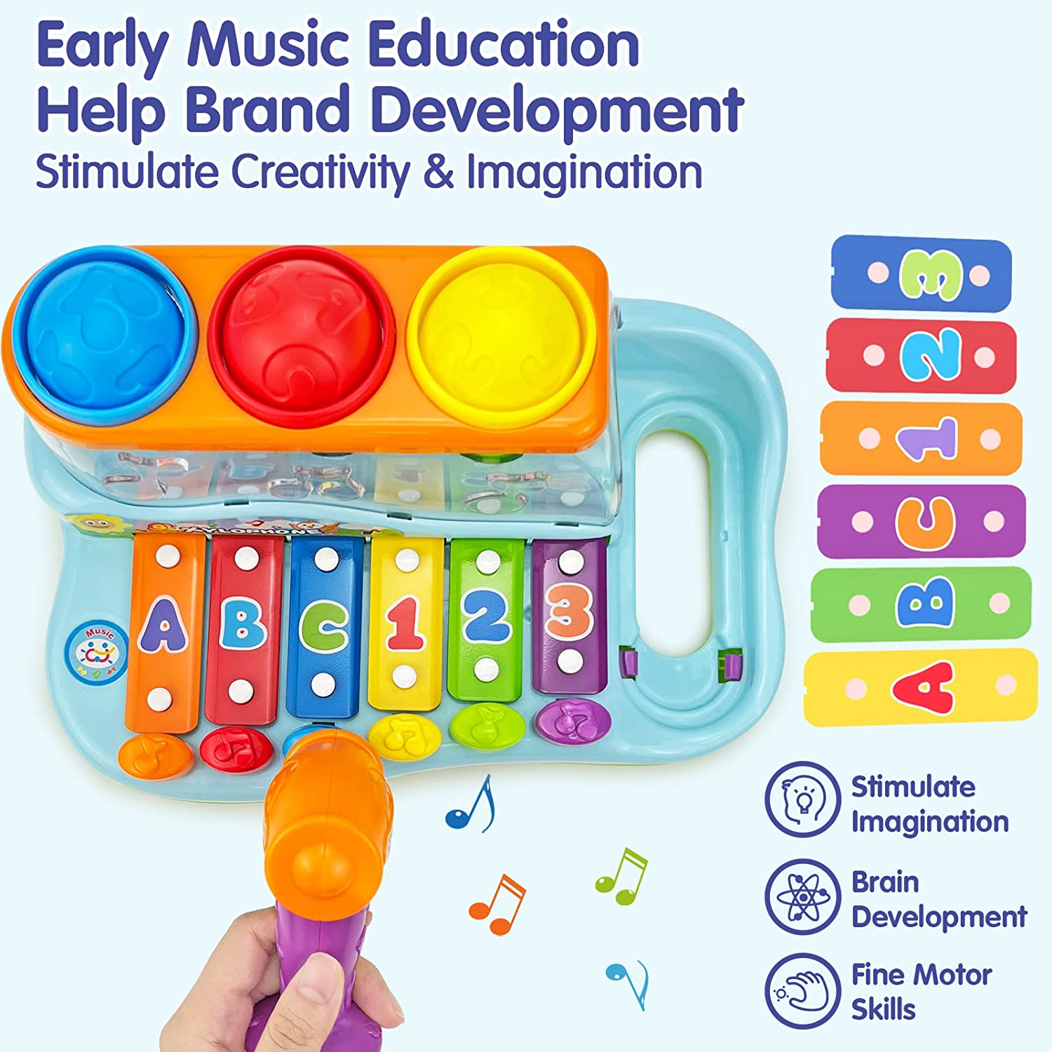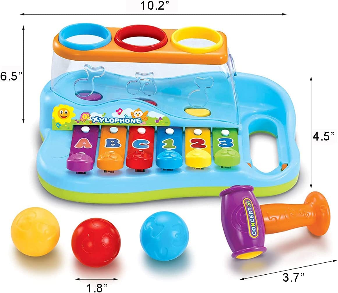 Explore the different notes and sounds by letting the balls fall on the keys or slide out the slideway and create your own melodies with the mallet! With the hammer pounding xylophone, there are many ways to make music!