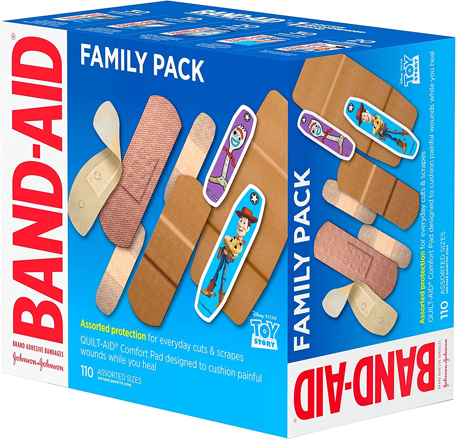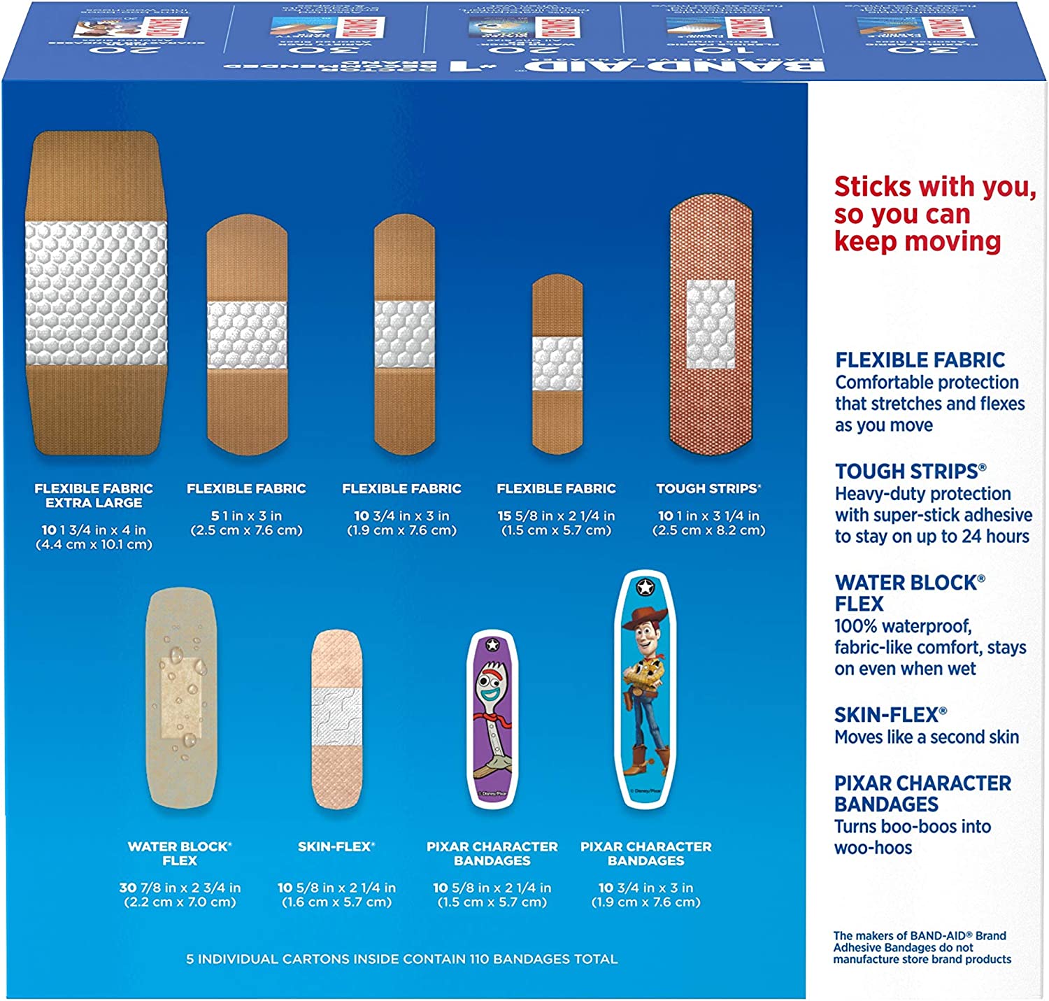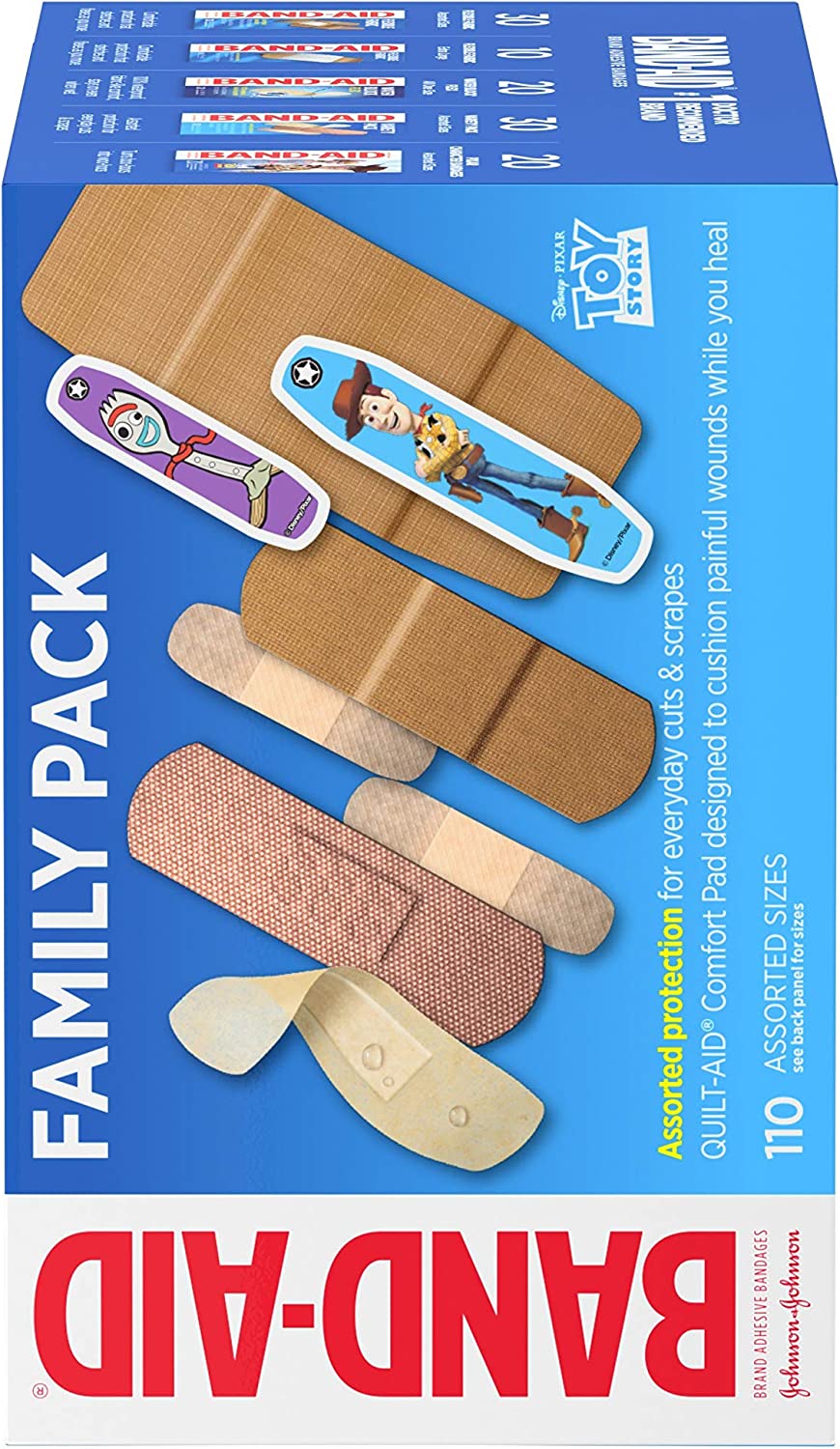Band-Aid Brand Adhesive Bandages Family Variety Pack provides first aid protection for everyday minor cuts, scrapes, and wounds. This variety pack contains -adhesive bandages from the #1 doctor-recommended brand. Water Block Flex bandages, feature an ultra-flexible, 100% waterproof design made of fabric-like material that stays in place even when wet. 40 Flexible Fabric adhesive bandages in four different sizes provide comfortable protection that stretches and flexes as you move. Tough Strips Heavy-Duty Bandages made of durable Dura-Weave fabric with a strong adhesive stay in place for up to 24 hours. Skin-Flex Bandages with MotionMax Technology expand and contract for the ultimate skin-like fit, even during activity, and provide a durable hold that lasts through handwashing. Finally, Pixar Bandages featuring iconic Toy Story characters are perfect for kids and toddlers. For best results, apply these sterile adhesive bandages to clean, dry skin and replace as needed.