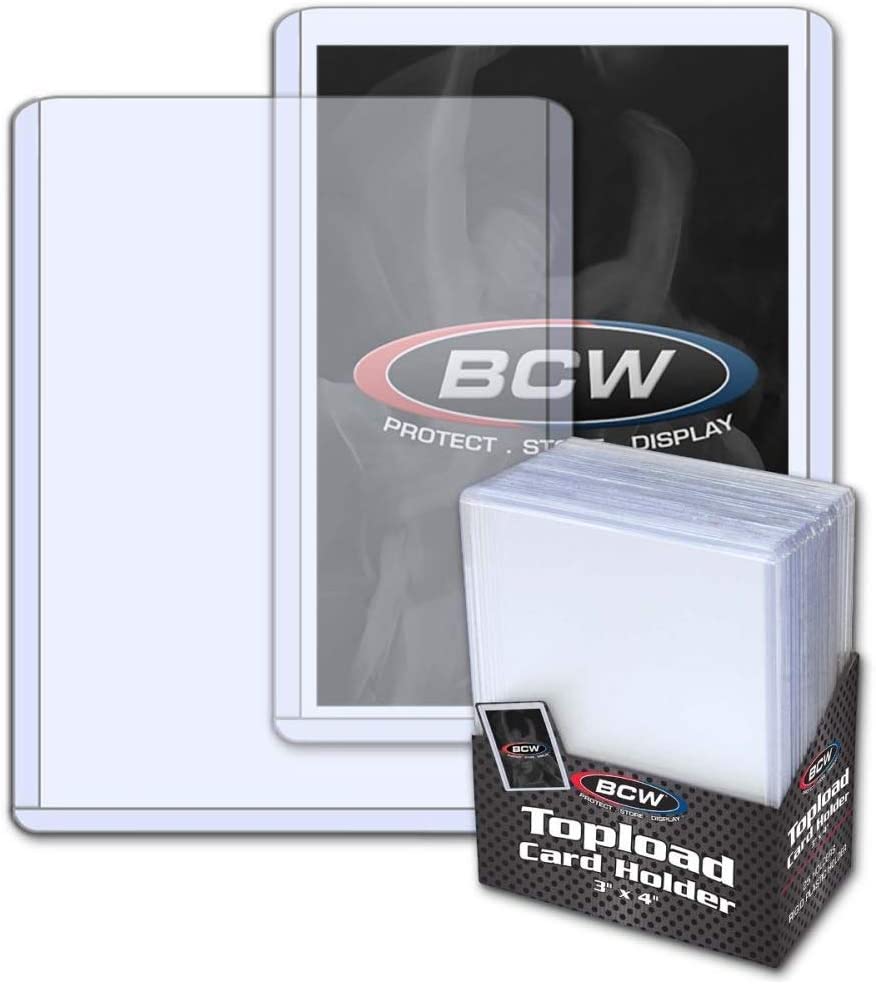 BCW Standard 3-Inches x 4-Inches toploaders are made of high-quality, rigid PVC. These top loading holders are some of the most popular rigid individual cardholders in the collectible card industry. Use this product to protect, store or display collectible baseball cards, football cards, hockey cards, or other trading cards like Magic The Gathering, Pokemon, YuGiOh, and others. 12-mil thickness panels. Topload, open on the short side. Each cardholder holds a standard trading card - Up to 20 pts. 25 holders per pack