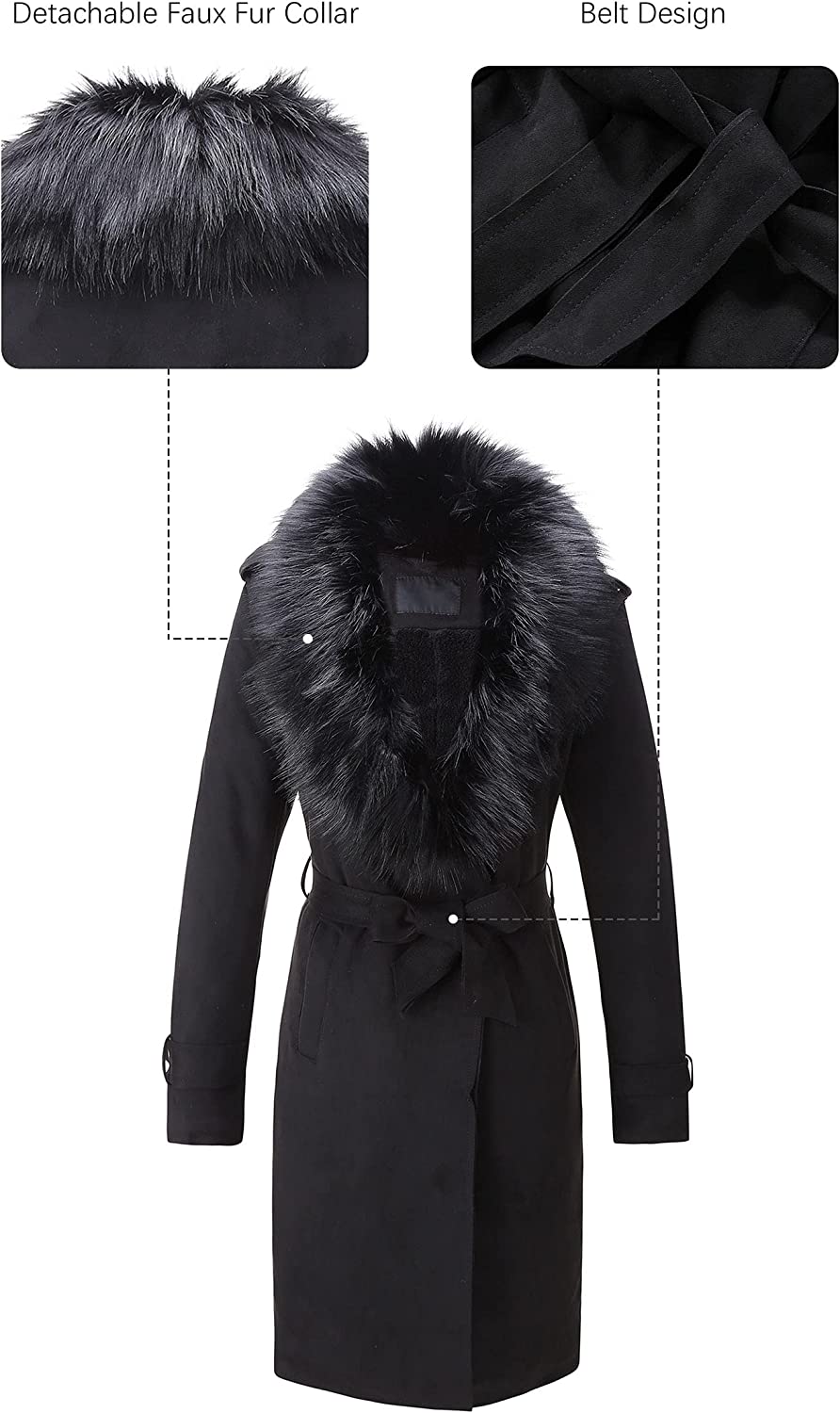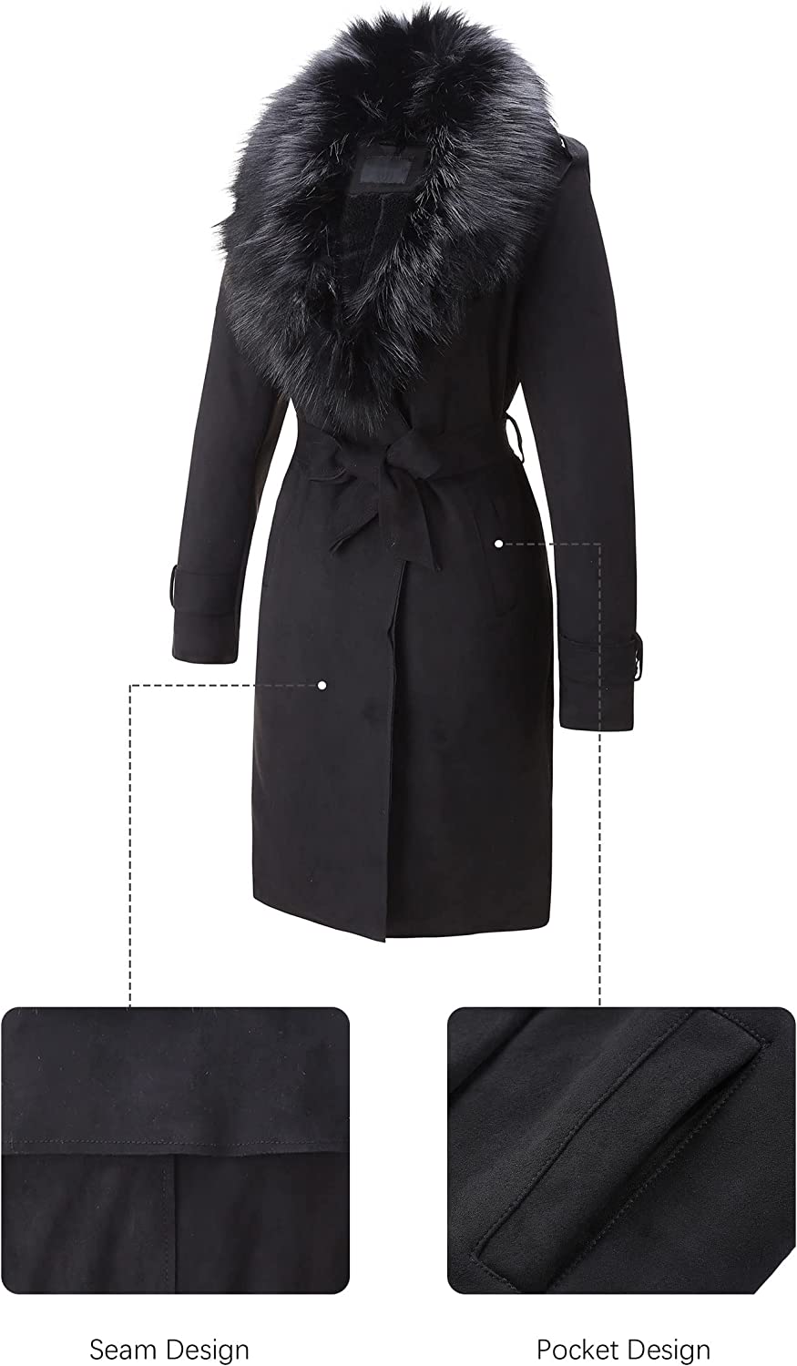 Bellivera Womens Faux Suede Leather Long Jacket, Fall and Winter Fashion Trench Coat Cardigan with Detachable Fur Collar