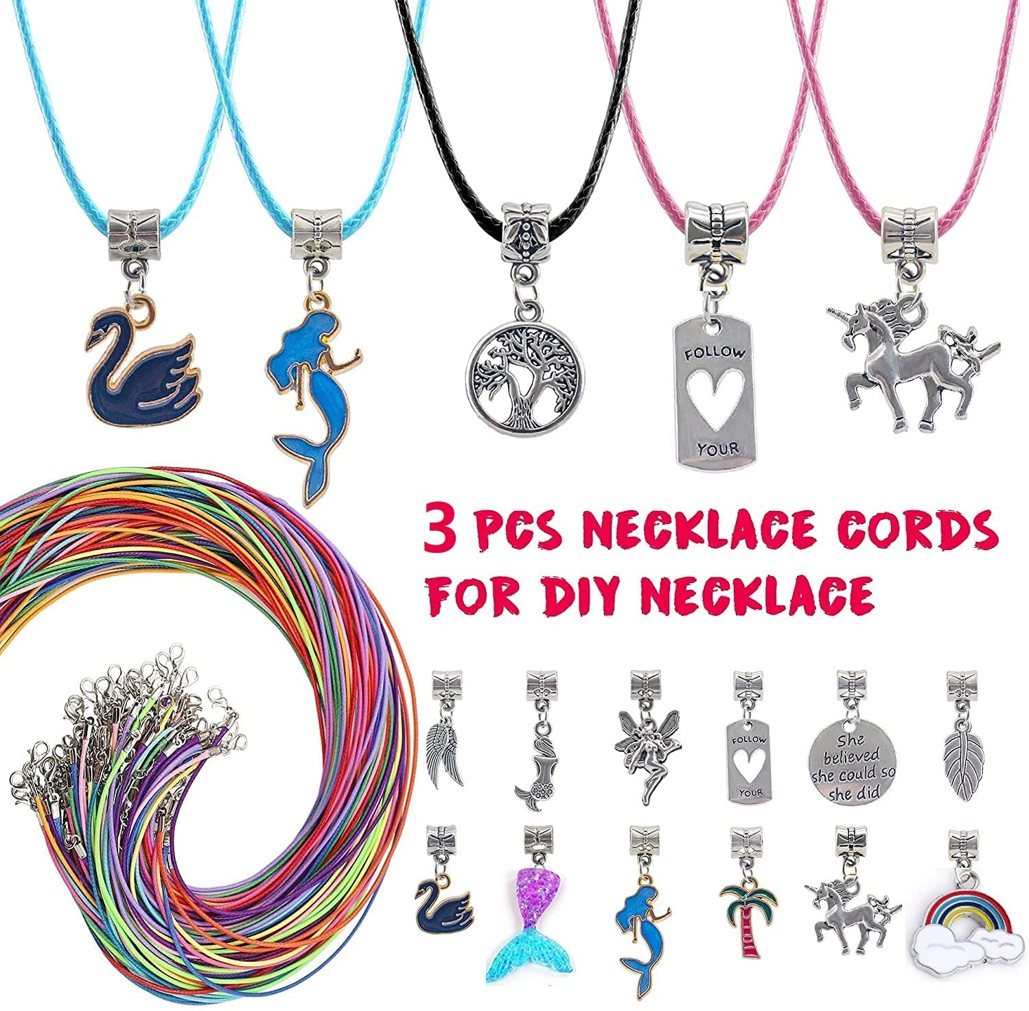 Package include: 16x European big hole beads, 26x Charm and Pendants , 26x Colored beads, shamballa, rainbow, crystal beads 3x Snake chain bracelet and 3 Necklace Cords