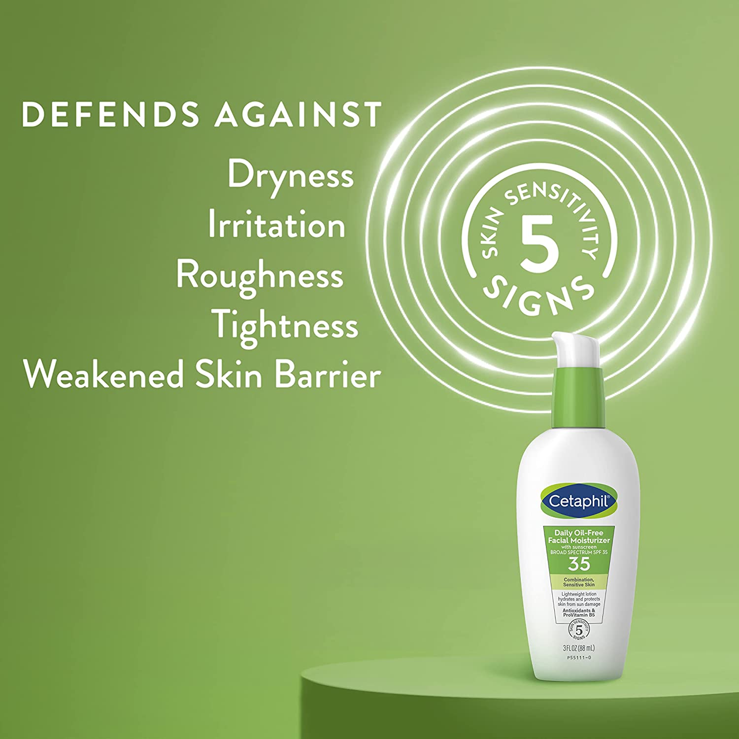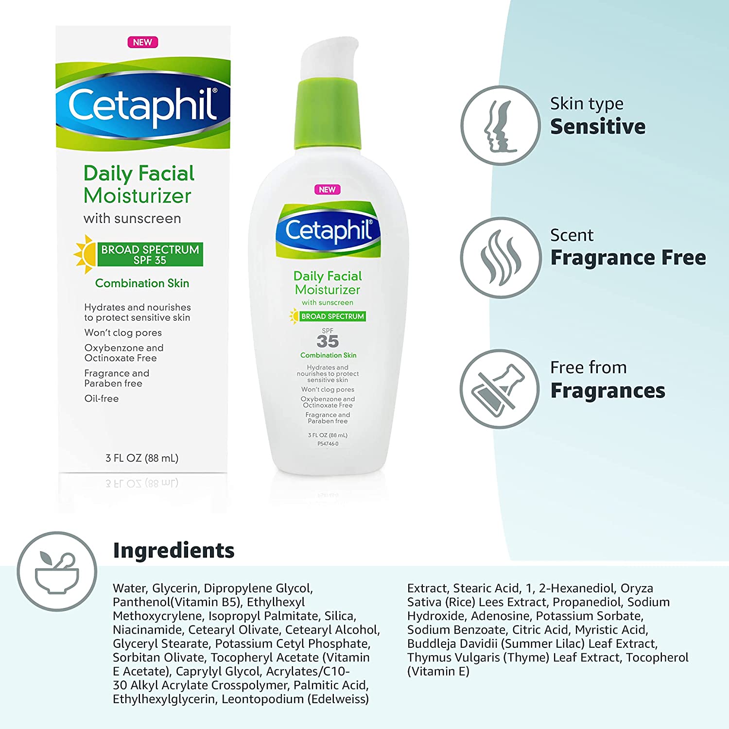 Cetaphil Daily Facial Moisturizer SPF 35 is a lightweight and fast absorbing moisturizer designed to hydrate sensitive combination skin for 24 hours. Broad spectrum SPF 35 protects against the sun's damaging UVA and UVB rays to keep skin looking young and vibrant while edelweiss flower extract nourishes to repair the skin barrier. This moisturizer contains ProVitamin B5 to soothe sensitive skin while a unique blend of antioxidants prevent damage from surface free radicals. The lightweight, non-greasy formula absorbs quickly, providing instant and long lasting hydration without clogging pores. Fragrance free, oil free and paraben free, this gentle yet effective face lotion with sunscreen is clinically tested for even the most sensitive skin.