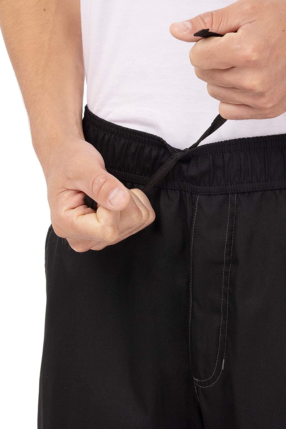 4.6 oz. 65/35 poly/cotton 'lite' twill fabric with Cool Vent inserts on side seam and back of knee, double-needle stitching, curved elastic waistband with drawstring, zipper fly, 2 slanted side pockets and 2 back pockets with CV detail.