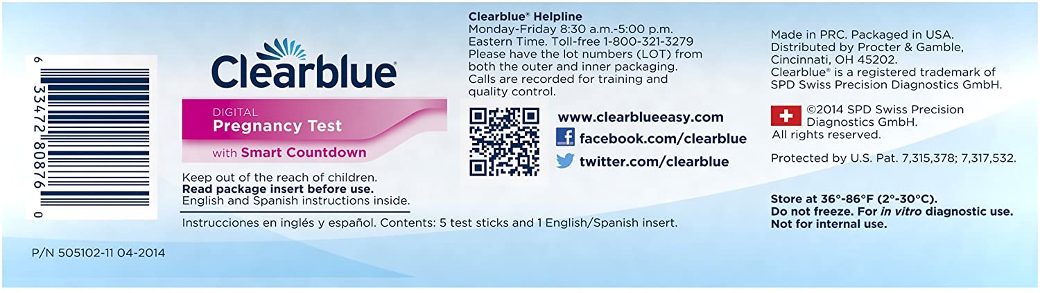 The Clearblue Digital Pregnancy Test with Smart Countdown (Prueba de embarazo Digital Clearblue con cuenta regresiva inteligente) is the only test that has a unique progress indicator that counts down to the result and gives you confidence every step of the way until your result is digitally displayed in words. The Clearblue Digital Pregnancy Test with Smart Countdown with its wide tip makes it easy to take the test accurately. The unique Floodguard Technology helps reduce the #1 reported cause of user error by over 70%(4) by keeping excess urine from flooding the test strip. The Clearblue Digital Pregnancy Test with Smart Countdown gives you accuracy and reassurance while you wait for your result.