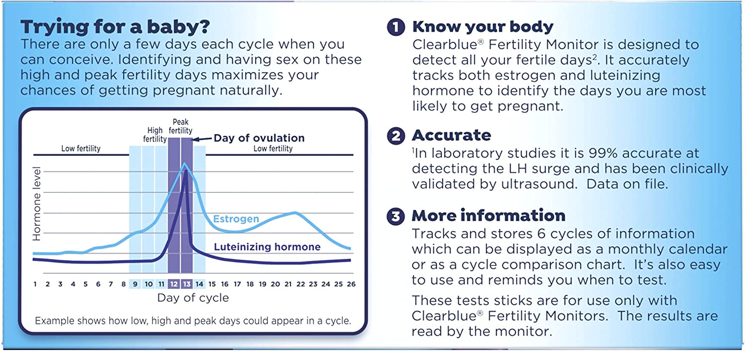 For use with the Clearblue Fertility Monitor, the Clearblue Fertility Monitor Test Stick pack includes 30 individually wrapped test sticks. The majority of women who are trying to get pregnant will need 10 test sticks each cycle. Women with irregular or long cycles may have to use 20 test sticks each cycle. The Clearblue Fertility Monitor comes from the #1 OB-GYN ovulation recommended brand*** and is proven to increase the chances of getting pregnant by 82% in the first cycle of use*. It's designed to identify all your fertile days**, typically up to 6, which is more days than traditional ovulation predictor kits. This discrete, feminine, handheld fertility monitor tracks two key fertility hormones, estrogen and luteinizing hormone, it shows your fertility information on the easy to use touch screen as well as summarizing up to 6 cycles data on one screen for easy comparison.