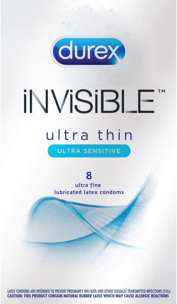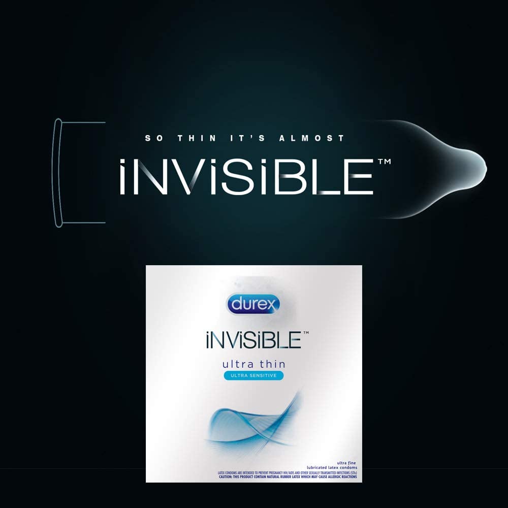 Durex Invisible Ultra Thin Ultra Sensitive Lubricated Latex Condoms add excitement while still providing a high level of protection. Each condom is extra thin for extra sensitivity. With its fitted shape, the Invisible condom is designed to be easy to put on and comfortable to wear. It is teat ended and lubricated. Unlike some latex condoms, Invisible condoms are manufactured in a way that produces a more pleasant scent. This means you won't have to worry about unpleasant distractions and instead can relax and enjoy every moment with your partner. Invisible condoms are the thinnest condom developed by Durex, designed to maximize sensitivity, while still providing a high level of security and protection. All Durex condoms are safe to use for five years from the date manufactured, depending on environmental conditions. With this pack of Durex condoms, you'll always be prepared. description