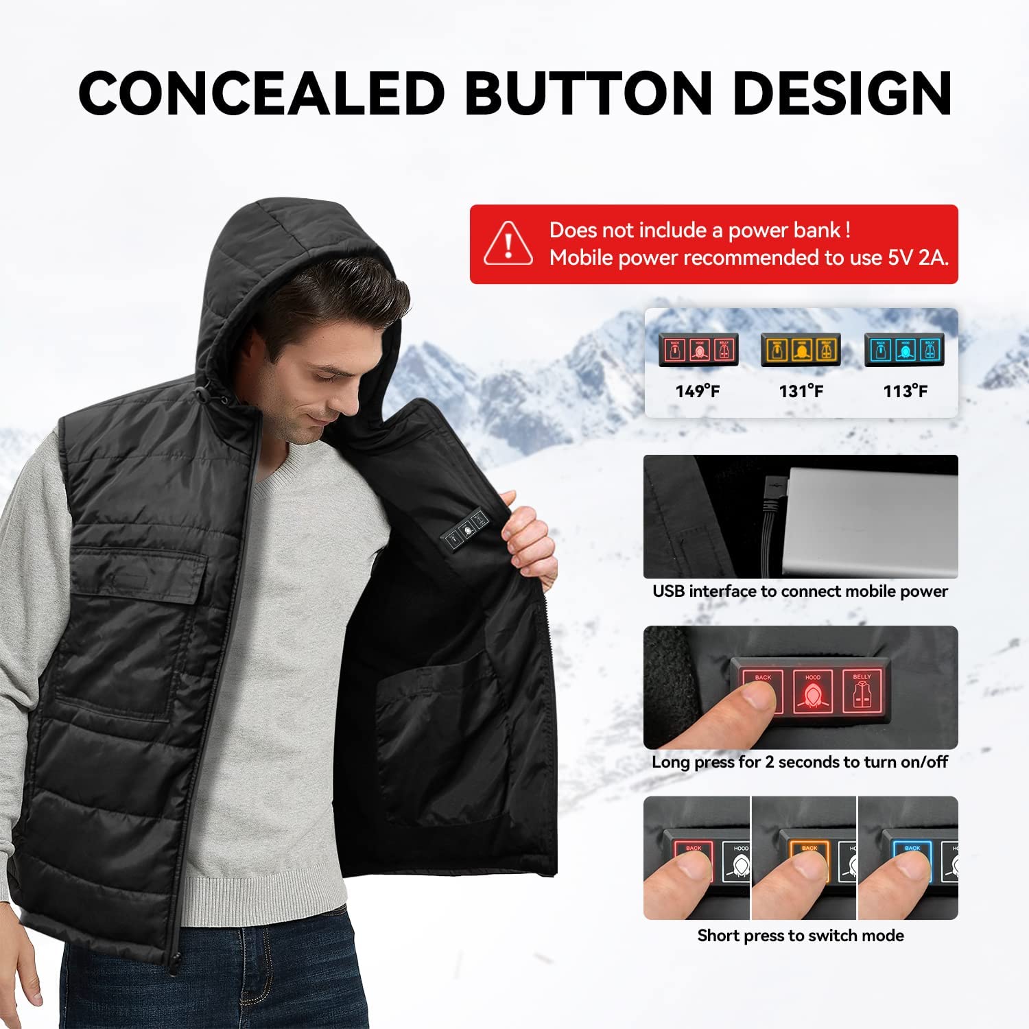 COSYYOSY Heated Vest with Hood for Men/Women, 6 Pockets, 5 Heating Panels, 3 Modes, Electric Outdoors Coat