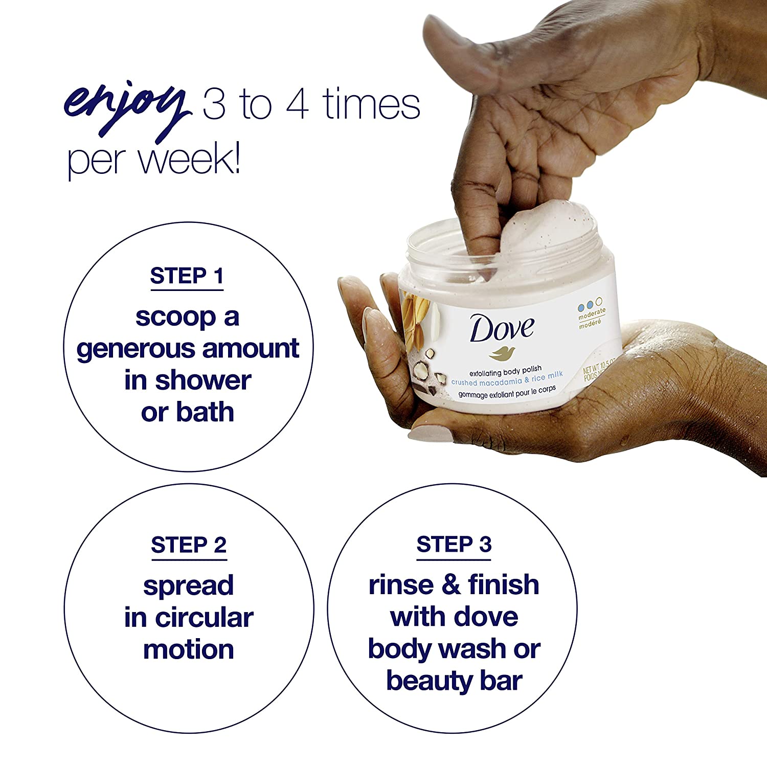 There’s one essential step for achieving smooth skin that shouldn’t be overlooked: exfoliation. So, gently buff away dry, dull skin while caring for your skin with Dove Macadamia and Rice Milk Exfoliating Body Polish. Made with ¼ moisturizing cream, this gentle exfoliating body scrub restores skin’s nutrients as it exfoliates, leaving your skin feeling silky smooth. With a smooth, easily spreadable texture, this Dove body exfoliator gives you beautifully creamy coverage while releasing a gently herbal and floral hypoallergenic fragrance. Get all the effectiveness you’d look for in exfoliators or a shower scrub, but with the nourishment and care that your skin needs in the shower. To use, scoop a generous amount of Dove Macadamia and Rice Milk Exfoliating Body Scrub out of the jar. Massage all over your body in circular motions for creamy coverage, and then rinse away to reveal silky smooth skin. Use 3-4 times per week as part of your skin care regimen, followed by Dove Body Wash or Beauty Bar for touchably soft skin. Try Dove Body Polish to get beach-ready skin, prep skin for tanning, or to help exfoliate before shaving to help prevent ingrown hairs. You'll love the feeling of silky smooth skin all over. Plus, when you buy Dove, you can be assured you’re caring for your skin with products that are PETA Cruelty-Free certified.