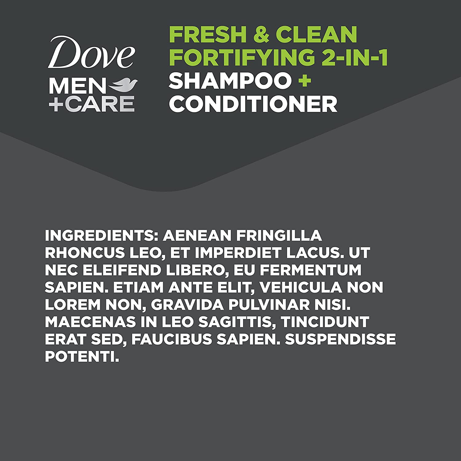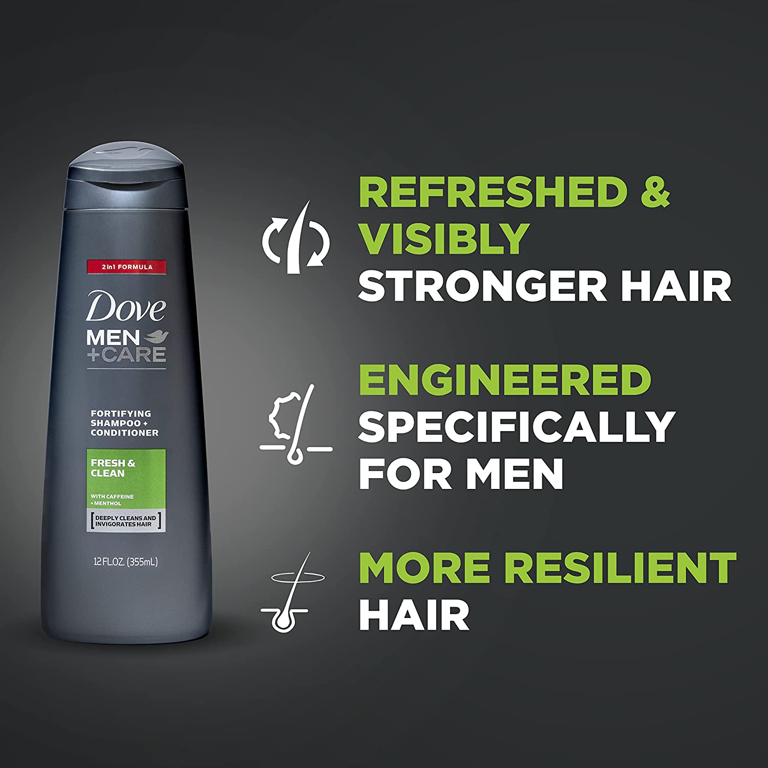 Dove Men+Care Fortifying 2 in 1 Shampoo and Conditioner makes hair stronger and more resilient so that men can pursue their active lifestyles. This shampoo for men is designed specifically for those that want fresh clean hair and have a concern about hair loss. It deeply cleans and invigorates hair with a refreshing effect, and is infused with caffeine + menthol. It helps strengthen hair, leaving it visibly healthy, thicker and resilient, with a dual 2-in-1 formula that functions as a shampoo and conditioner so that it cleanses and conditions hair simultaneously. This 2-in-1 consolidates your shower routine to keep up with men’s active lifestyles and everyday activities that can weaken hair, making it more prone to hair fall from breakage and cause concern about hair loss. This shampoo and conditioner system is available in the following sizes: 12 oz, 25.4 oz, 40 oz, and 3 oz. Great hair doesn’t stop in the shower! Complete your hair care regimen after using 2 in 1 shampoo and get great more resilient hair with the Dove Men + Care Sculpting Paste for a natural look, Defining Pomade for a sleek and polished finish, or Control Gel for all-day hold. Use it with the entire line of Dove Men + Care products for the perfect grooming regimen, such as Dove Men + Care Extra Fresh Body Wash and Dove Men + Care Dry Spray Antiperspirant.