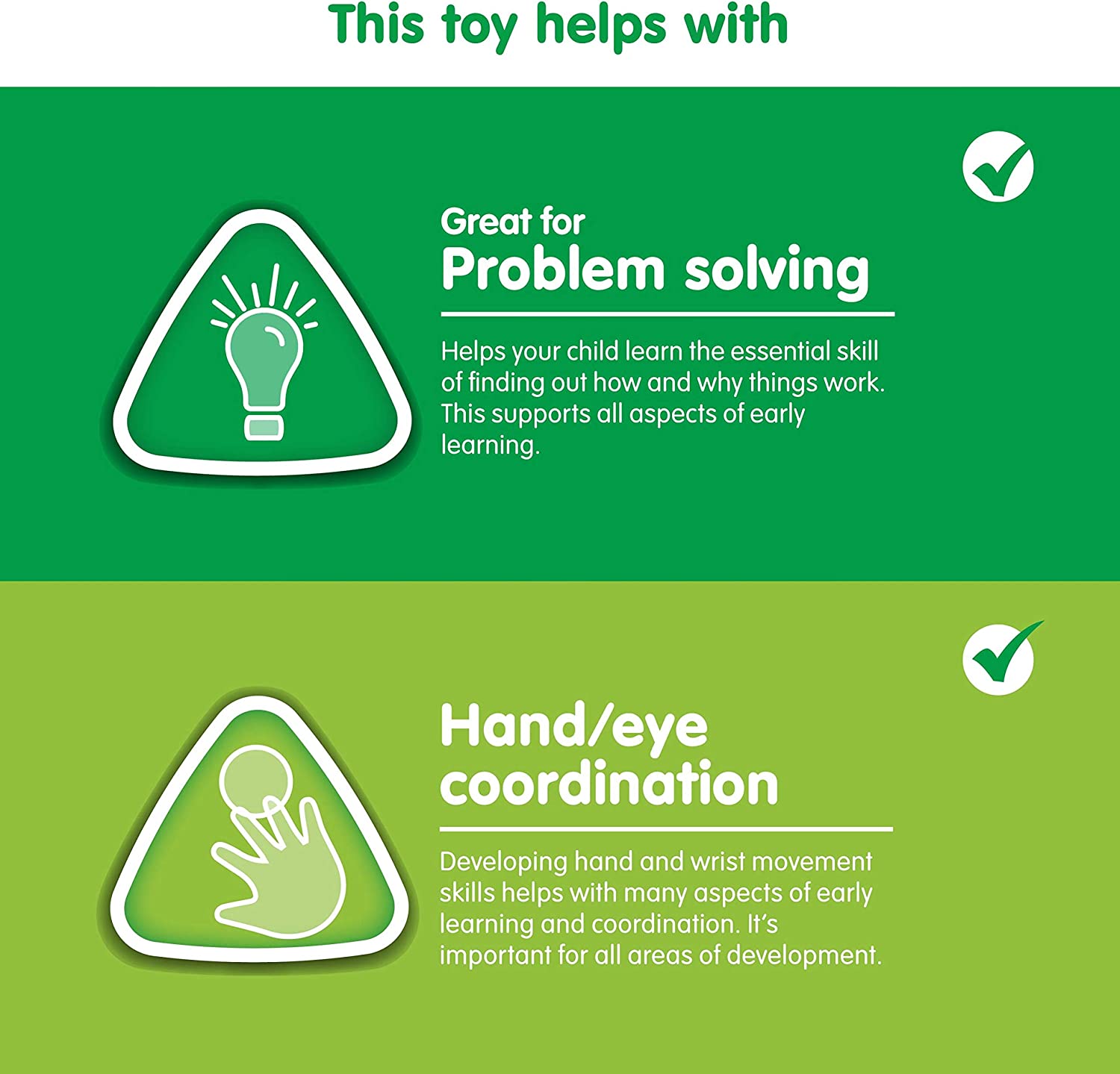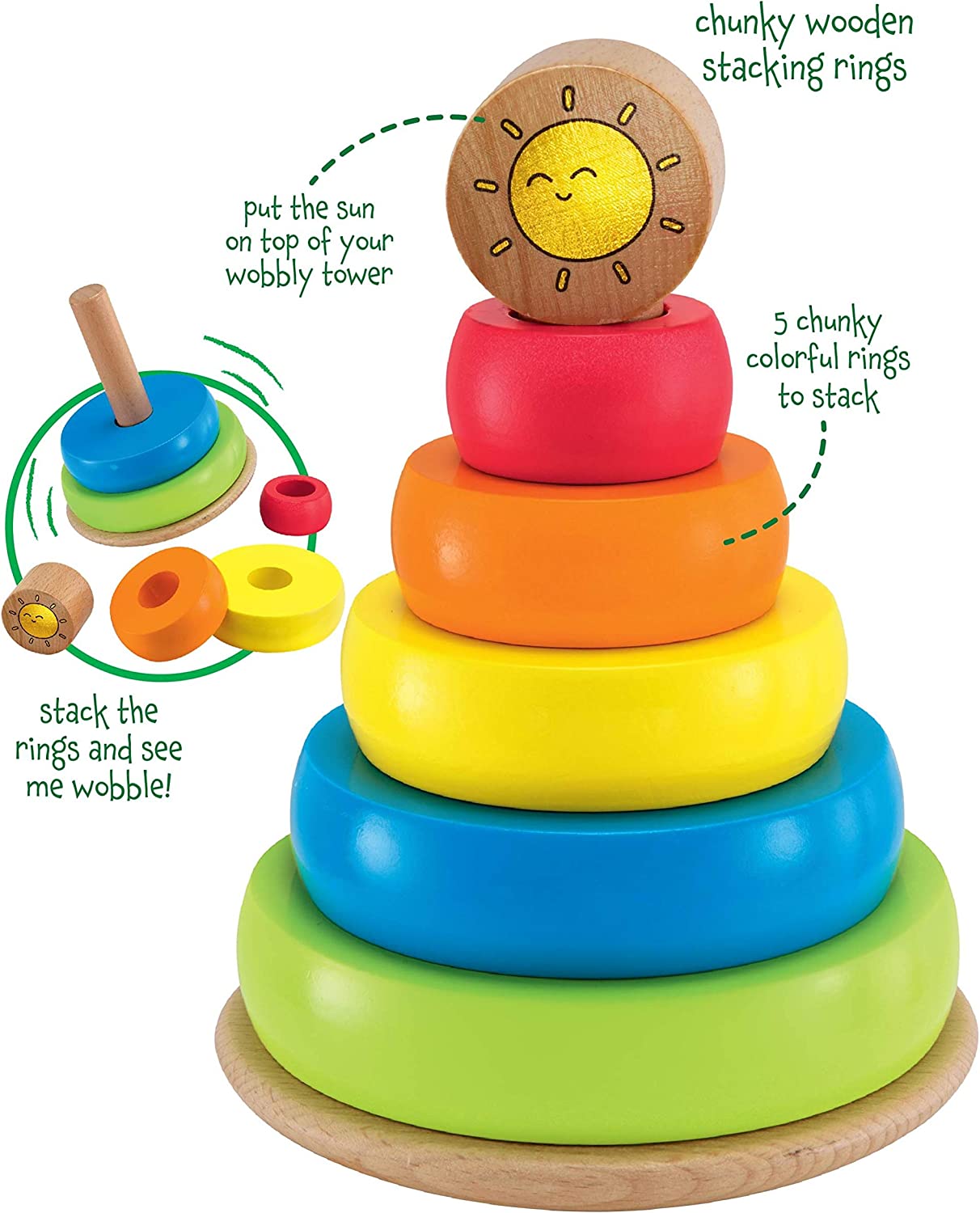 The traditional Wooden Stacking Ring set has been given a wobbly twist to make it even more fun! Stack the five brightly colored, chunky, wooden, stacking rings onto the base as it wobbles about then top it off with the sun topper. This classic wooden toy will encourage children to problem solve and enhances fine motor skills, including boosting reaction time and balance. Count the colorful rings with your child as they stack them on the base and place the little sun on top, then give the toy a push to watch it weeble and wobble around. Ages 18 - 36 months Early Learning Centre is based in the United Kingdom and has been designing and developing high quality, innovative toys since we were established in 1974. We are proud of our heritage and, as a leading specialist of children’s development, we promise to always strive to be that little bit better, and that little bit different.