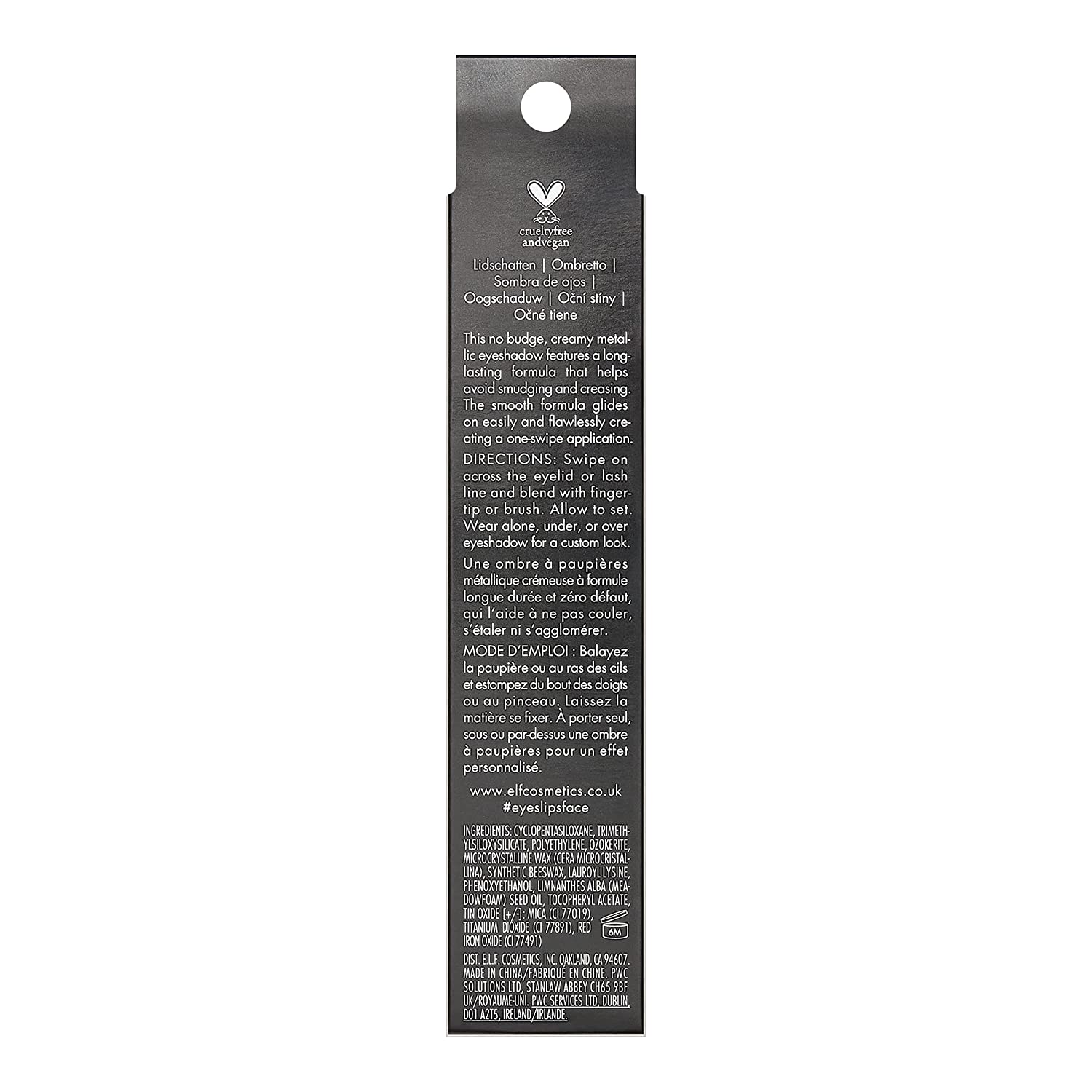 "A versatile cream eyeshadow stick that delivers high-pigment, metallic color with stay-put power. Play up those peepers—these easy-to-use metallic eyeshadow sticks give you highly pigmented, buildable color that stays put. The creamy formula glides on effortlessly as an eyeshadow or liner and allows you to create a range of looks, from everyday shimmer effects to bold smoky eyes. The twist-up design offers easy application while the convenient built-in sharpener keeps your precision point sharp. Available in 12 multi-dimensional shades. Why e.l.f. loves it: • A long-lasting creamy metallic formula that helps avoid smudging and creasing • Smooth formula glides on easily and flawlessly • One-swipe application • Convenient twist-up design • Includes a sharpener allowing you to sharpen the tip to use as an eyeliner or sharpen after everyday use for precision. Great for: All skin types Proud to be 100% vegan and cruelty-free, worldwide. Because kindness is chic."