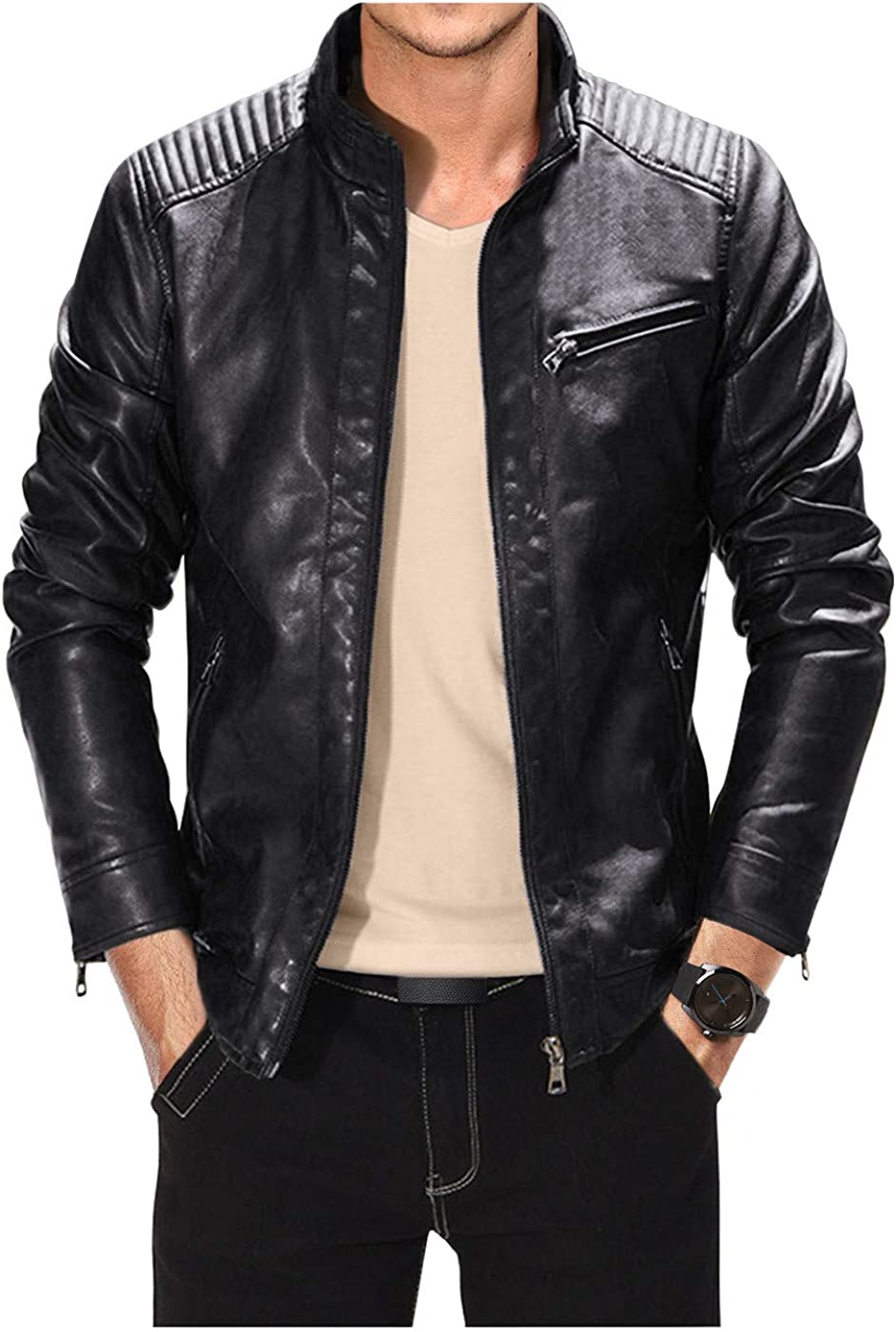 Fairylinks Leather Jacket Men Black Slim Fit Motorcyle Lightweight