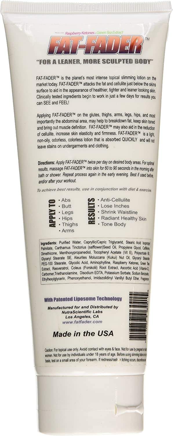 FAT-FADER is the planet's most intense topical fat loss lotion on the market today. FAT-FADER attacks the fat and cellulite just below the skins surface to aid in the appearance of healthier, tighter and leaner looking skin. This clinically tested formula begins to work in just a few days for results you can SEE and FEEL! Applying FAT-FADER on the glutes, thighs, arms, legs, hips, and most importantly the abdominal area, may help to breakdown fat, keep skin toned and bring out muscle definition. FAT-FADER may also aid in the reduction of cellulite, increase skin elasticity and firmness. FAT-FADER is a light, non-oily, odorless, colorless lotion that is absorbed QUICKLY and will not leave stains on undergarments and clothing.