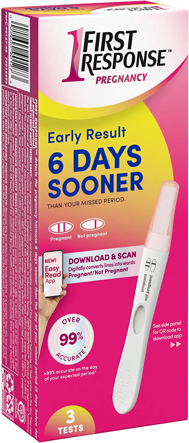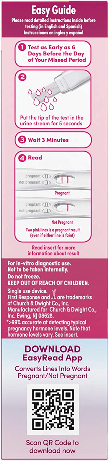 Featuring First-to-Detect Technology, this First Response pregnancy test is sensitive enough to capture scant amounts of the pregnancy hormone to give you results 6 days sooner than your missed period*. The Early Result test is over 99 accurate* and compatible with the free EasyRead App, that instantly converts your pregnancy test lines into “Pregnant” or “Not Pregnant” results.