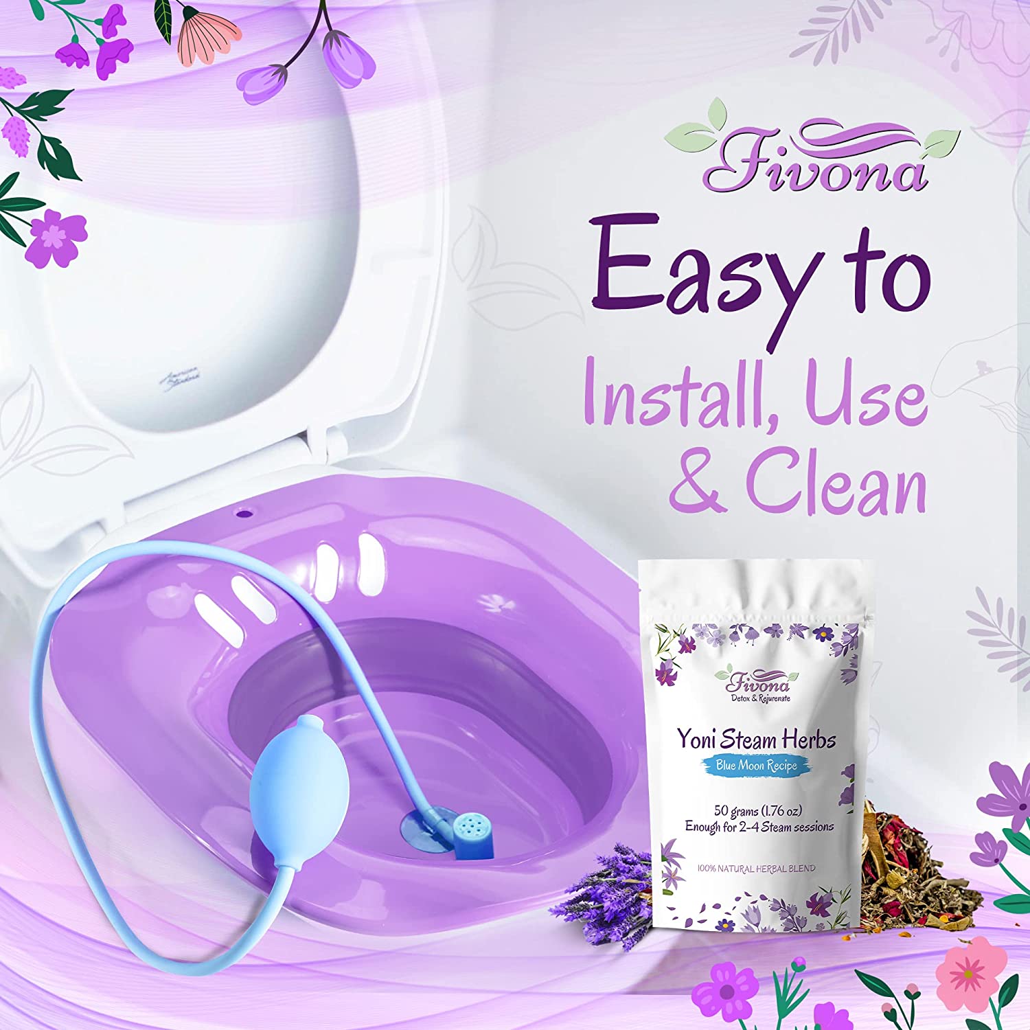 Fivona Yoni Steam Kit 4-in-1 Bundle of Expandable Steaming Seat for Toilet Pump Storage Bag and All Natural Blue Moon Herbal Blend for V-Steam Therapy Cleansing Detox Tightening Fertility Increase
