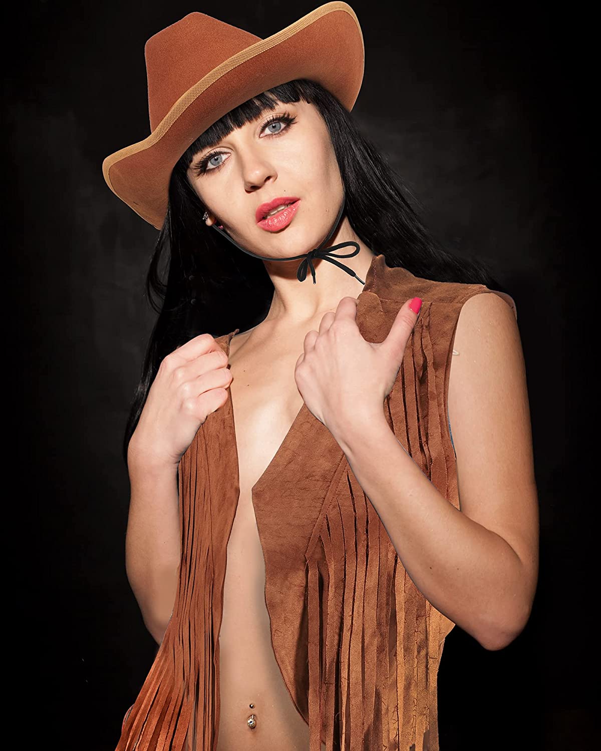 Fringe Vests Cowgirl Outfits for Women Faux Suede Tassels 70s Hippie Clothes Vest Jacket Western Cowgirl Hat Brown Cowboy Hat