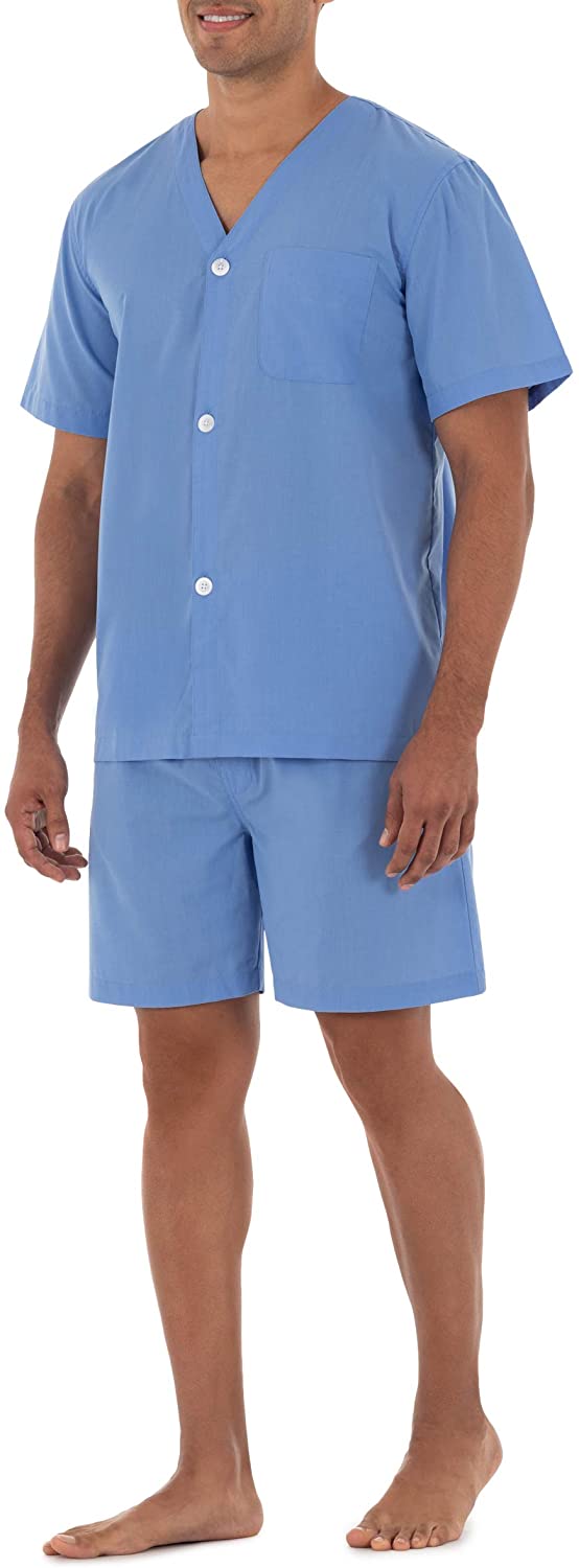 These quality pajamas will keep you cool and comfortable. Constructed with easy care fabric, these pajamas are soft and smooth. The V neck styled top features a button front and patch pocket. The shorts have a covered elastic waistband with an adjustable button closure and button fly.
