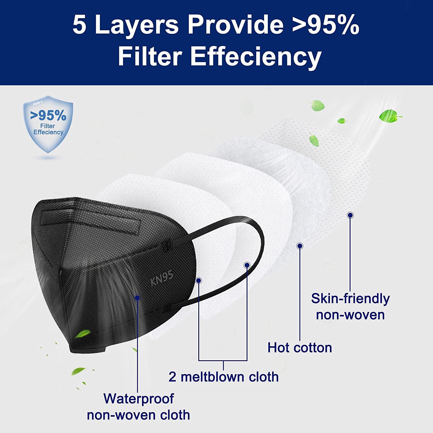 Funight KN95 Face Masks 25 Pack 5-Ply Breathable Filter Disposable Face Masks Black