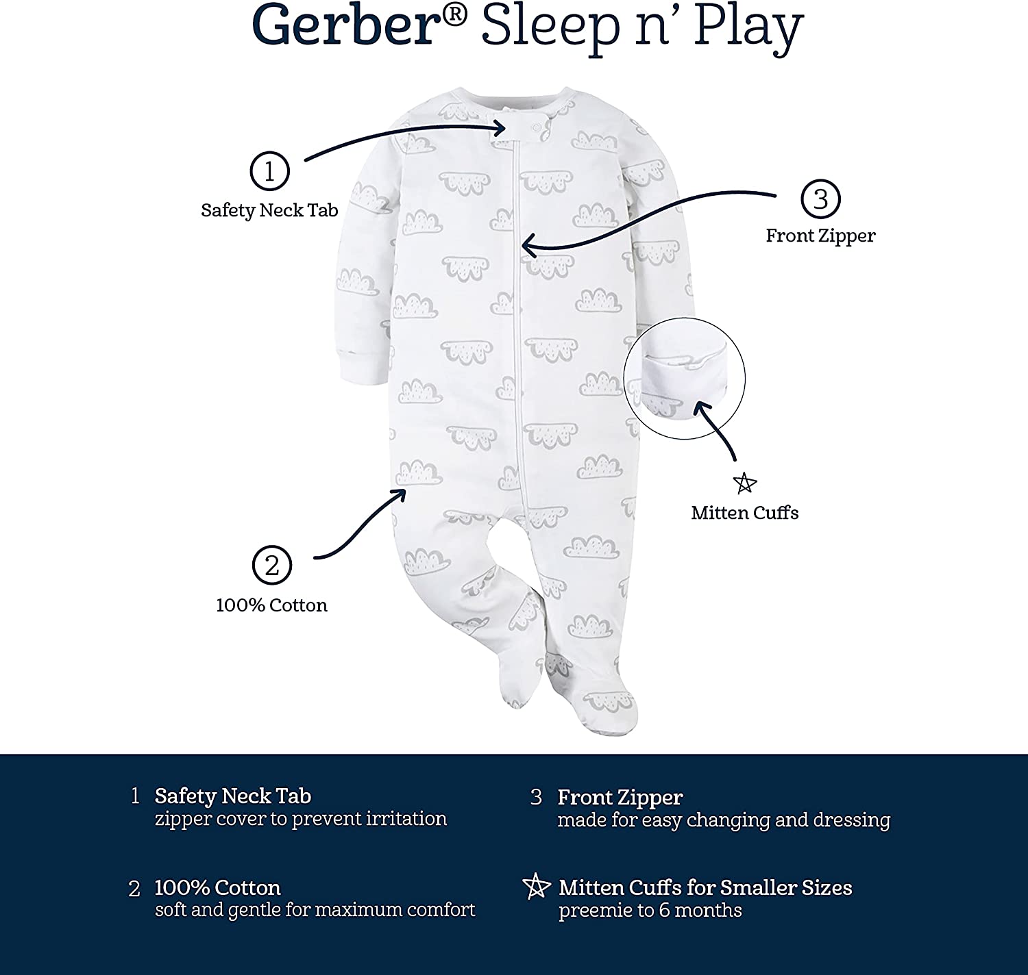Gerber Sleep ‘n Plays are the ultimate footie pajamas baby is sure to love! These soft footies are made with 100% cotton, a comfortable fabric that’s perfectly breathable to prevent irritation against baby’s delicate skin. They’re appropriate to use as newborn footie pajamas as they’re made to comply with all safe sleep standards. They’re also available in sizes all the way up to 6-9M to fit older or larger babies. Each Gerber Sleep n’ Play features a zipper down the front of the outfit to allow for easy and fast diaper changes. This zipper makes the baby sleeper incredibly easy to put on as well as to take off. Atop the zipper is a safety tab with a snap to keep the zipper held in place. This reduces irritation caused by baby’s chin being poked by the zipper. These baby sleepers are footed to add extra warmth which is wonderful for sleepy time as well as if there is a chill in the air. It also means no fooling around with baby socks! These footie pajamas kids will love to wear to bed because of their supreme comfort as well as cute and fun patterns. Available in assorted colors and patterns, they’re suitable baby girl sleepers as well as baby boy sleepers. Babies love the comfortable feel and parents love how cute they look! But these Sleep n’ Plays aren’t just for sleep! They’re wonderful comforatble, casual outfits to wear during the day. They allow babies mobility and provide warmth. They’re perfect for play but are cute enough to be worn out on the town! These outfits are perfect to wear on a stroll outside, to the grocery store, to day-care, or to grandma and grandpa’s house! The possibilities are endless! The versatility of these outfits truly gives them a spectacular value that all parents will appreciate. They make an excellent gift for any baby boy or baby girl you know and love! Gerber provides high-quality products that are easy and convenient for parents as well as cute and comfortable for baby. Gerber provides safe products that parents can trust.