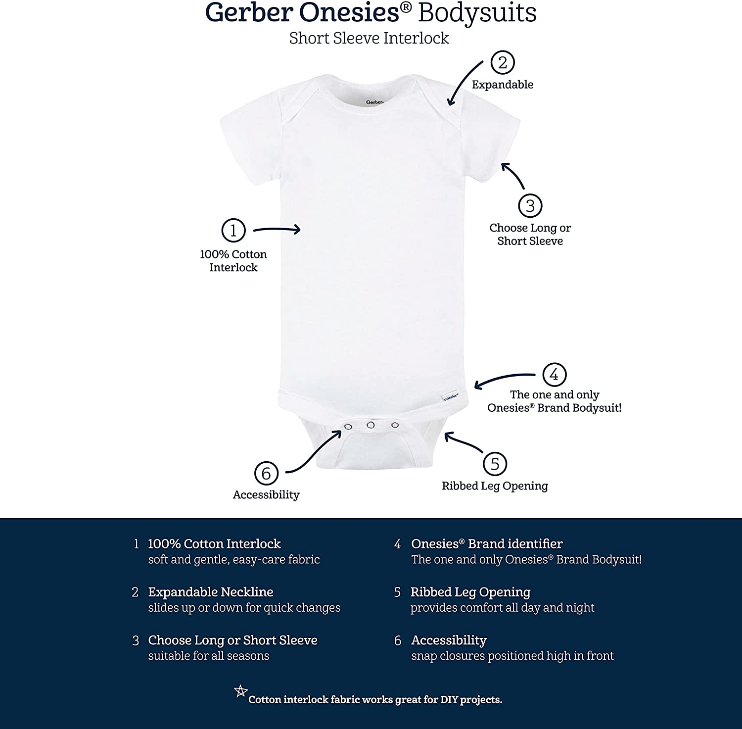 We took our premium bodysuits to the next level by using cotton interlock fabric instead of our tried and true, comfy classic, cotton rib. Cotton interlock is extremely soft, warmer than cotton rib, and holds the perfect amount of stretch, making it perfect for baby clothes. Our baby clothes are designed to keep your little one feeling at their best and to bring parents peace of mind. With easy-to-change features, safety features, and super soft fabrics, we offer baby girl clothes and baby boy clothes that are sure to fit any family’s needs. If you’re looking for baby sleepwear, we offer baby pajamas, baby PJs, baby footies, baby sleepers, and baby fleece pajamas. We also offer baby socks and baby shoes. Pair baby girl shoes to her favorite baby outfits. We offer baby accessories such baby sun hat, baby caps, baby hats, baby mittens, no scratch mittens, baby headbands, and baby girl headbands. Our baby bodysuits or baby Onesies® Brand bodysuits make excellent baby shower gifts, but we also offer baby gift sets. Be sure to check out our baby pants, baby shorts, baby shirts, baby tops, and baby bottoms. Our baby swimwear and baby swimsuits are a big hit too! Our baby clothing sizing ranges from baby girl clothes preemie, baby boy clothes preemie, baby girl clothes newborn, baby boy clothes newborn, baby girl clothes 0-3 months, baby boy clothes 0-3 months, baby girl clothes 3-6 months, baby boy clothes 3-6 months, baby girl clothes 6-9 months, baby boy clothes 6-9 months, baby girl clothes 12 months, baby boy clothes 12 months, baby girl clothes 18 months, baby boy clothes 18 months, baby girl clothes 24 months, baby boy clothes 24 months, toddler girl clothes 2T, toddler boy clothes 2T, toddler girl clothes 3T, toddler boy clothes 3T, toddler girl clothes 4T, toddler boy clothes 4T, toddler girl clothes 5T, toddler boy clothes 5T. We have all you covered, whether it’s baby boy stuff or baby girl stuff! OEKO-TEX Certification Number: 08.HIN.60591 HOHENSTEIN HTTI