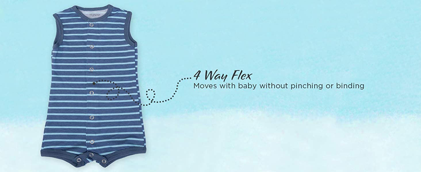 Hanes Ultimate Flexy 2 Pack Sleeveless Rompers were designed with baby in mind. They are super soft, flexible, and are available in 4 simple sizes to fit baby longer.