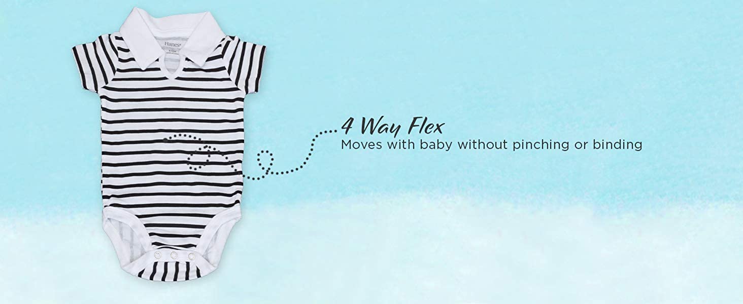 Hanes Ultimate Flexy 3 Pack Short Sleeve Polo Bodysuits were designed with baby in mind. They are super soft, flexible, and are available in 4 simple sizes to fit baby longer.