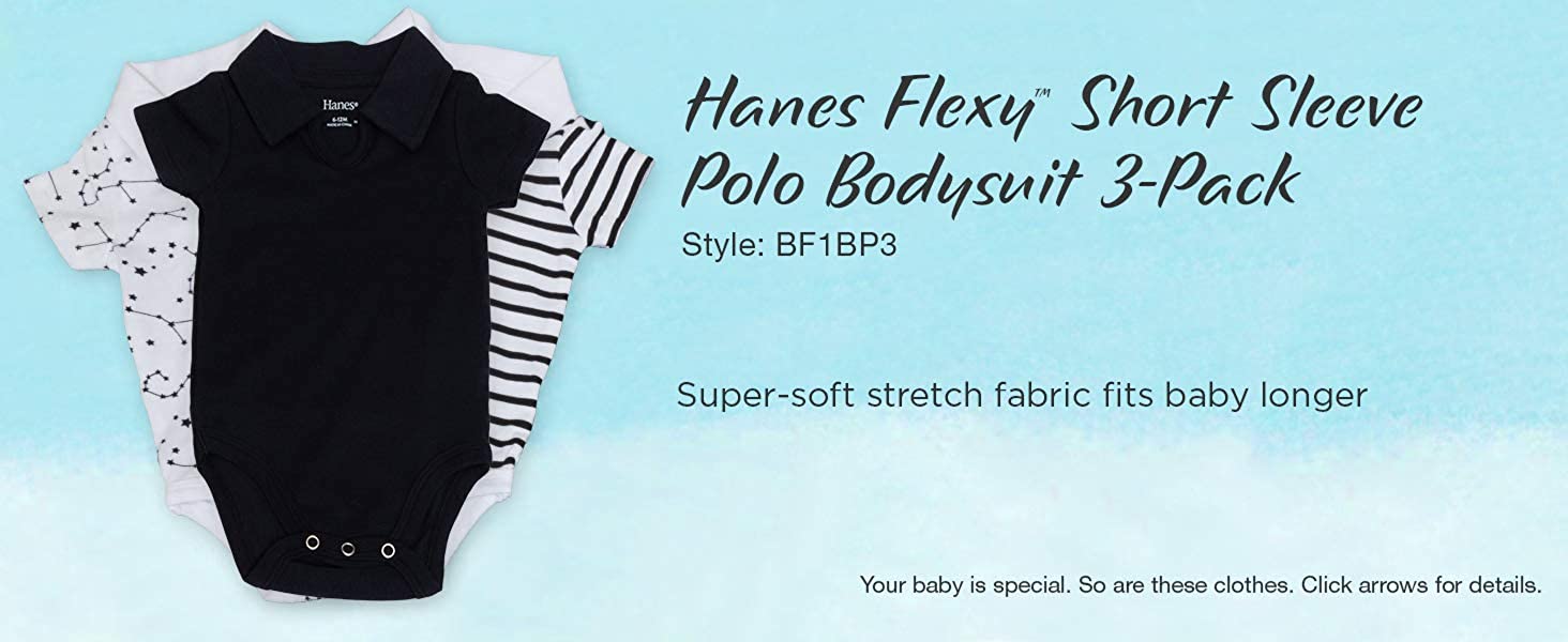 Hanes Ultimate Flexy 3 Pack Short Sleeve Polo Bodysuits were designed with baby in mind. They are super soft, flexible, and are available in 4 simple sizes to fit baby longer.