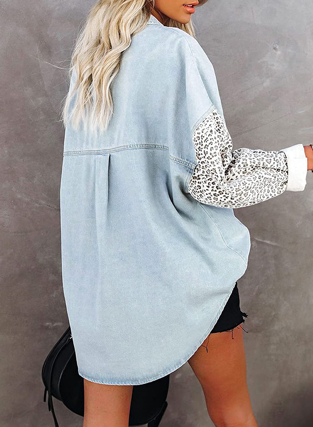 Happy Sailed Womens Leopard Contrast Denim Jackets Oversized Long Sleeve Button Down Jean Shacket Jacket S-2XL
