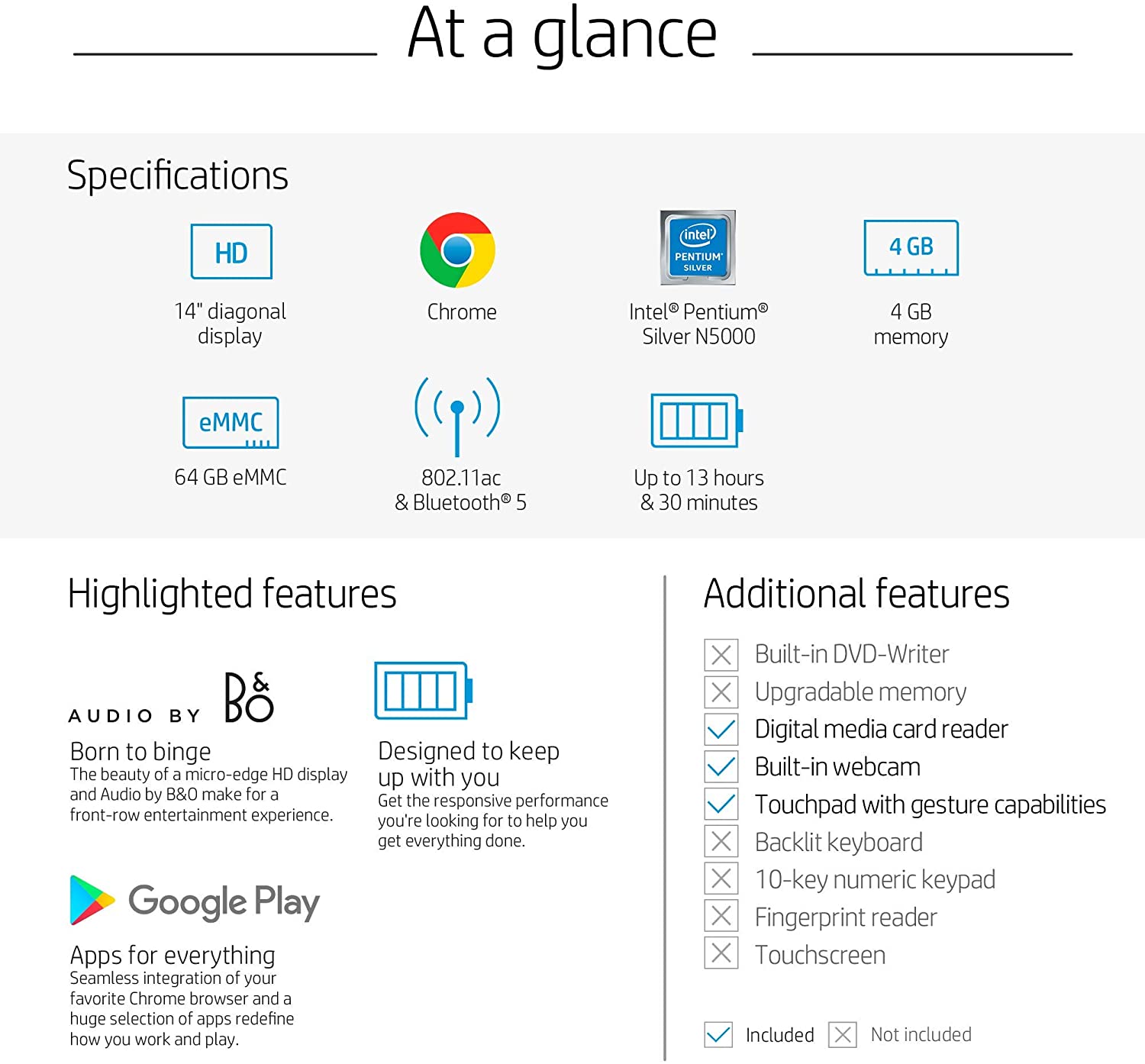 HP 2020 Flagship 14 Chromebook Laptop Computer 14-inch HD SVA Anti-Glare Display Intel Celeron N5000 Processor 4GB DDR4 64GB eMMC WiFi Webcam Chrome OS (Renewed)