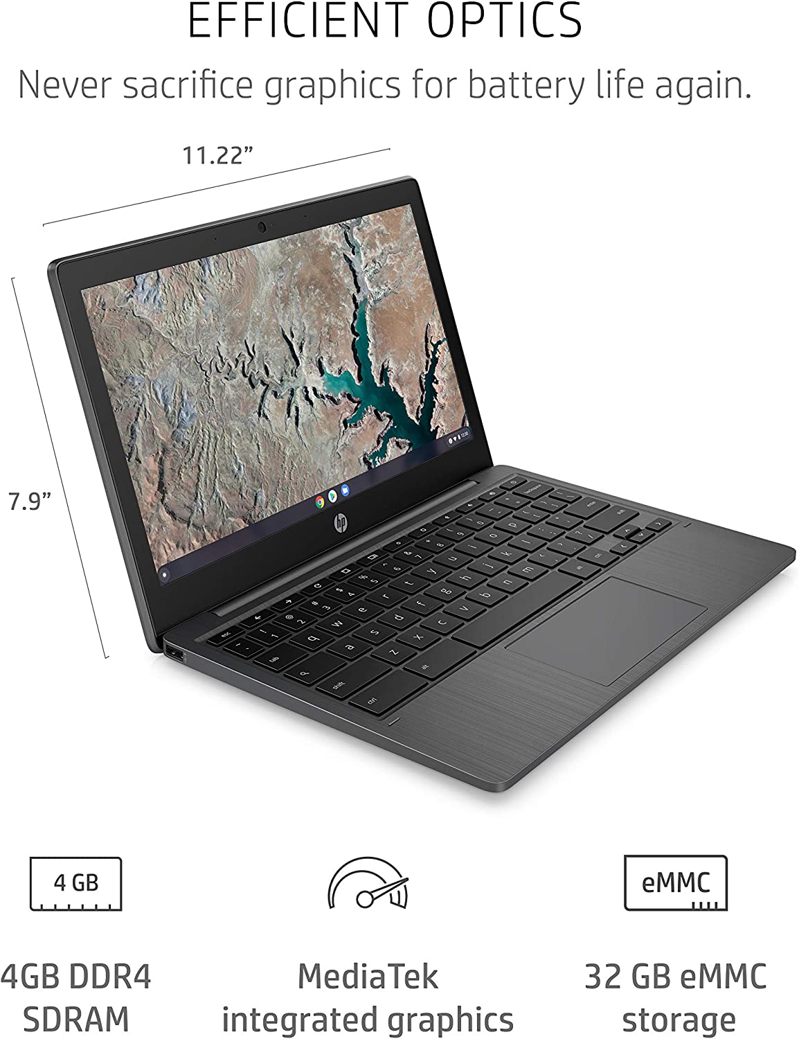 This Ash Gray HP Chromebook 11a Laptop is light and durable, so you can work or play on the go. It travels well and has a long battery life, letting you stay connected without having to search for an outlet. Switch between using this laptop for gaming, connecting with friends, and getting your schoolwork done with the powerful MediaTek mobile processor, full-size keyboard, and 11-inch display. Also, Google Chrome and Android apps are all seamlessly integrated on Google’s easy-to-use OS. And once you’ve gotten into your workflow, enjoy the anti-glare, 11-inch laptop screen with high-definition detail of 1 million pixels. This beautiful display is paired up with the MediaTek Integrated Graphics card, which has Octa-core CPU and GPU graphics processors and a multimedia engine, so you can watch movies, shows, or seminars without draining the battery. This portable, powerful HP laptop has all the efficiency and technology you need.