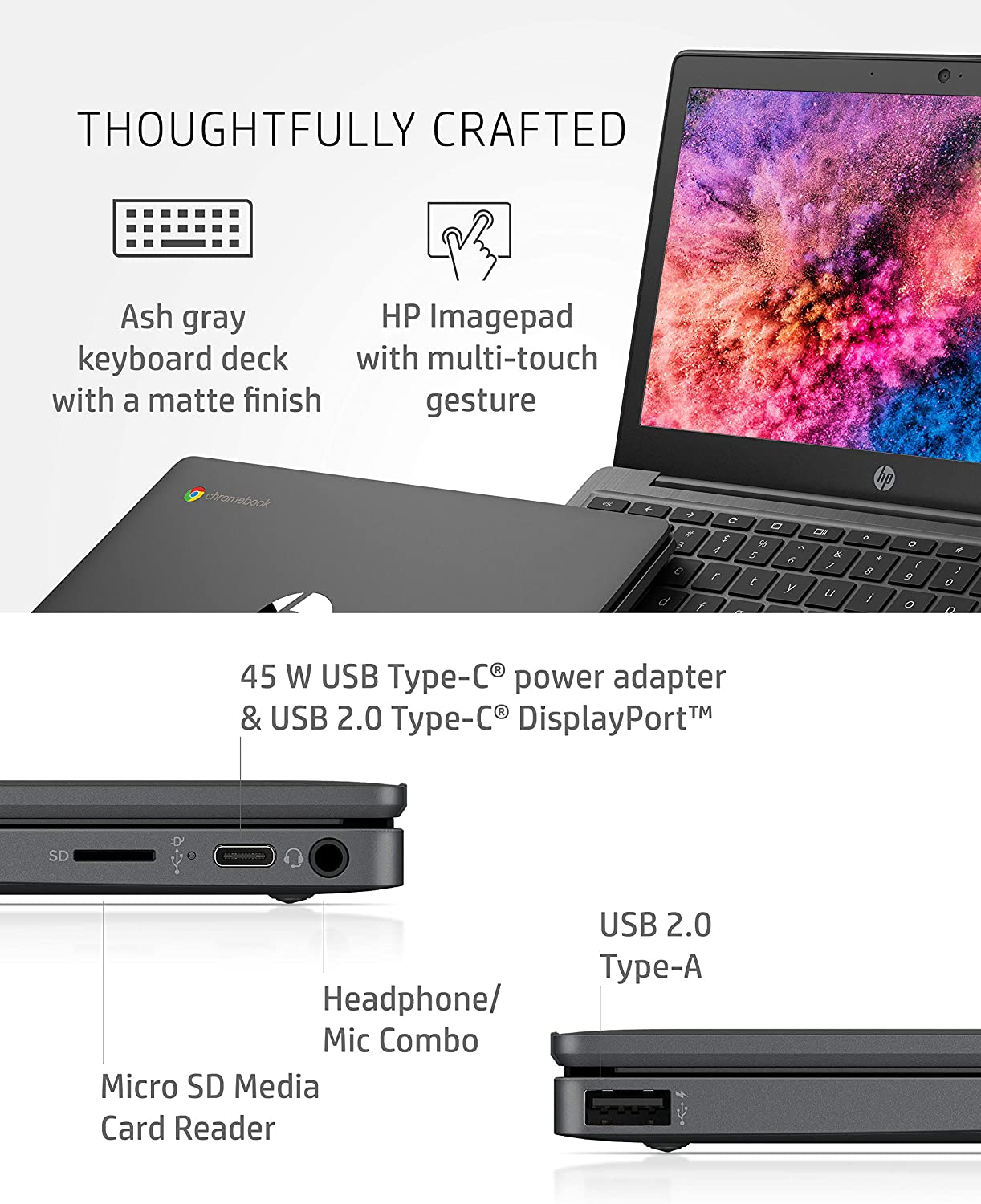 This Ash Gray HP Chromebook 11a Laptop is light and durable, so you can work or play on the go. It travels well and has a long battery life, letting you stay connected without having to search for an outlet. Switch between using this laptop for gaming, connecting with friends, and getting your schoolwork done with the powerful MediaTek mobile processor, full-size keyboard, and 11-inch display. Also, Google Chrome and Android apps are all seamlessly integrated on Google’s easy-to-use OS. And once you’ve gotten into your workflow, enjoy the anti-glare, 11-inch laptop screen with high-definition detail of 1 million pixels. This beautiful display is paired up with the MediaTek Integrated Graphics card, which has Octa-core CPU and GPU graphics processors and a multimedia engine, so you can watch movies, shows, or seminars without draining the battery. This portable, powerful HP laptop has all the efficiency and technology you need.