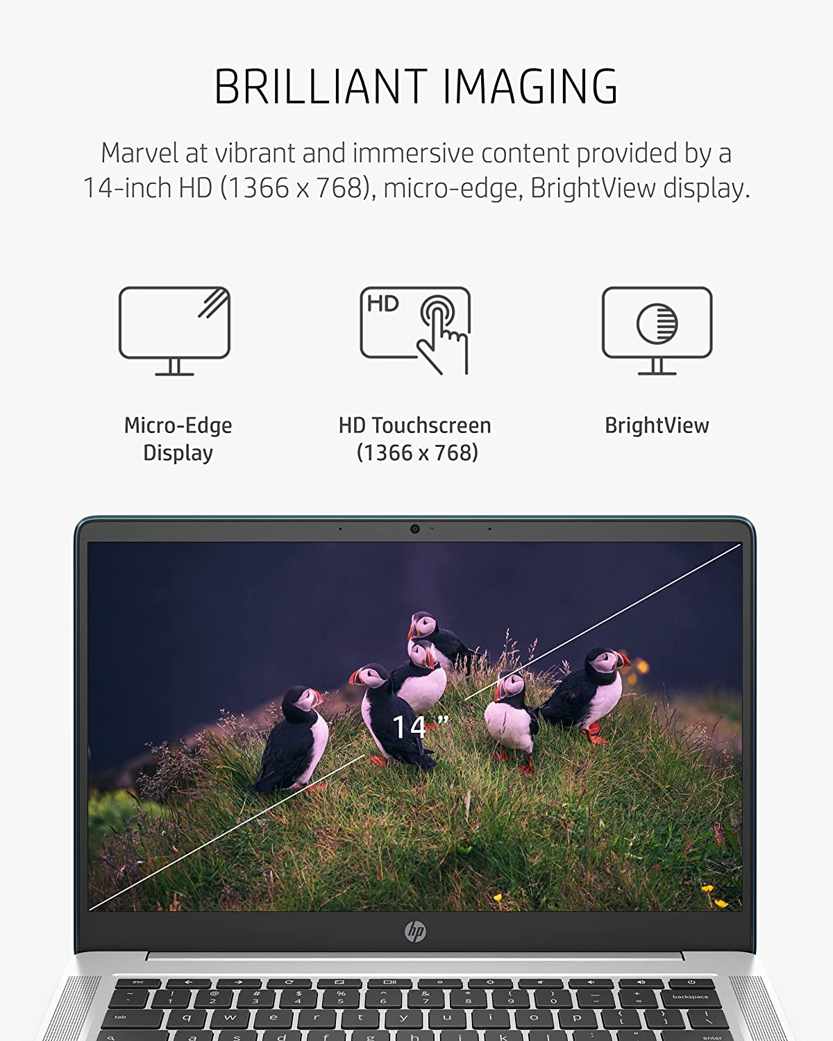 The HP Chromebook 14 Laptop empowers you to complete your tasks faster thanks to its responsive processor, ample storage, and apps for everything. With its 14-inch HD (1366 x 768), micro-edge, BrightView display (1), images appear more immersive than ever before. An Intel® Celeron processor (2) and visuals powered by UHD Graphics 600 (3), empowers you to complete your work seamlessly; then, kick back and relax while binge watching all your favorite shows. Storing assignments, presentations, and homework is hassle-free with 32 GB eMMC (4) storage; accessing your files is even faster with the laptop’s 4 GB of RAM. Plus, you can enjoy front-row-quality entertainment longer thanks to the computer’s long battery life of up to 14 hours with mixed usage (5). The Chrome operating system benefits from Google’s continually improved security measures, allowing your work to stay protected while you navigate through the web. Video chatting with colleagues, friends, and family becomes crystal-clear with the help of the HP Wide Vision 720p HD camera and integrated dual-array digital microphones (6). The included Wi-Fi 5 (2x2) and Bluetooth® 5.0 combo (7) allows your Chromebook 14 to maintain its rock solid internet connections. With its intuitive touchscreen, the 14-inch computer allows you to zoom, pinch, and swipe your content right from the screen (1) for enhanced productivity. The Chromebook laptop meets the criteria for energy efficiency, as well. HP’s 14” Chromebook is ENERGY STAR® certified (8) and EPEAT® Silver registered (9), making it safe for the environment. (1) High-definition (HD) content is required to view high definition images. (2) Multi-core is designed to improve performance of certain software products. Not all customers or software applications will necessarily benefit from use of this technology. (3) Shared video memory (UMA) uses part of the total system memory for video performance. System memory dedicated to video performance is not available for other use by other programs. (4) For storage drives, GB = 1 billion bytes. Actual formatted capacity is less. Portion of internal system storage is reserved and not user accessible. (5)Testing conducted by HP using Google Chrome OS power LoadTest. Battery life will vary and the maximum capacity of the battery will naturally decrease with time and usage. See chromium.org/chromium-os/testing/power-testing for test details. (6) Features may require software or other 3rd party applications to provide the described functionality. Internet service required and not included. (7) Wireless access point and internet service required and sold separately. Availability of public wireless access points limited. Wi-Fi 5 (802.11ac) is backwards compatible with prior Wi-Fi 5 specs.Bluetooth® is a trademark owned by its proprietor and used by Hewlett-Packard Company under license. (8) ENERGY STAR and the ENERGY STAR mark are registered trademarks owned by the U.S. Environmental Protection Agency. (9) Based on U.S. EPEAT® registration according to IEEE 1680.1-2018 EPEAT®. EPEAT® status varies by country. Visit www.epeat.net for more information.