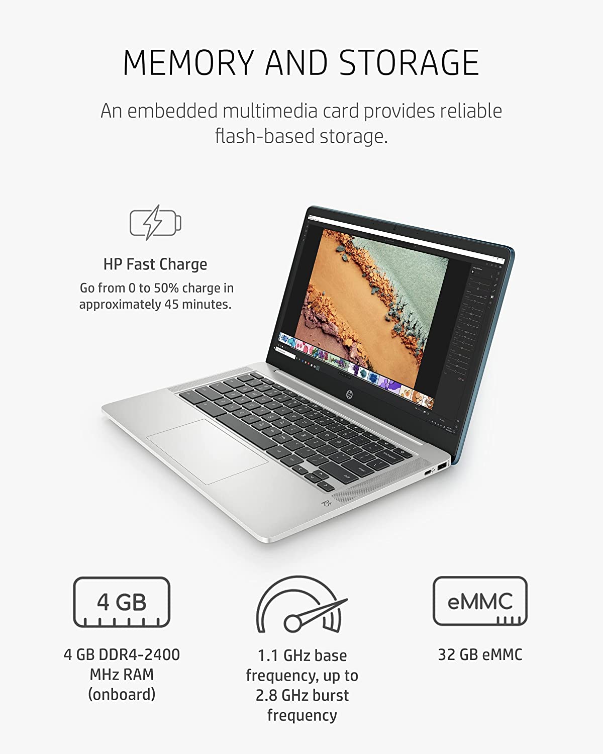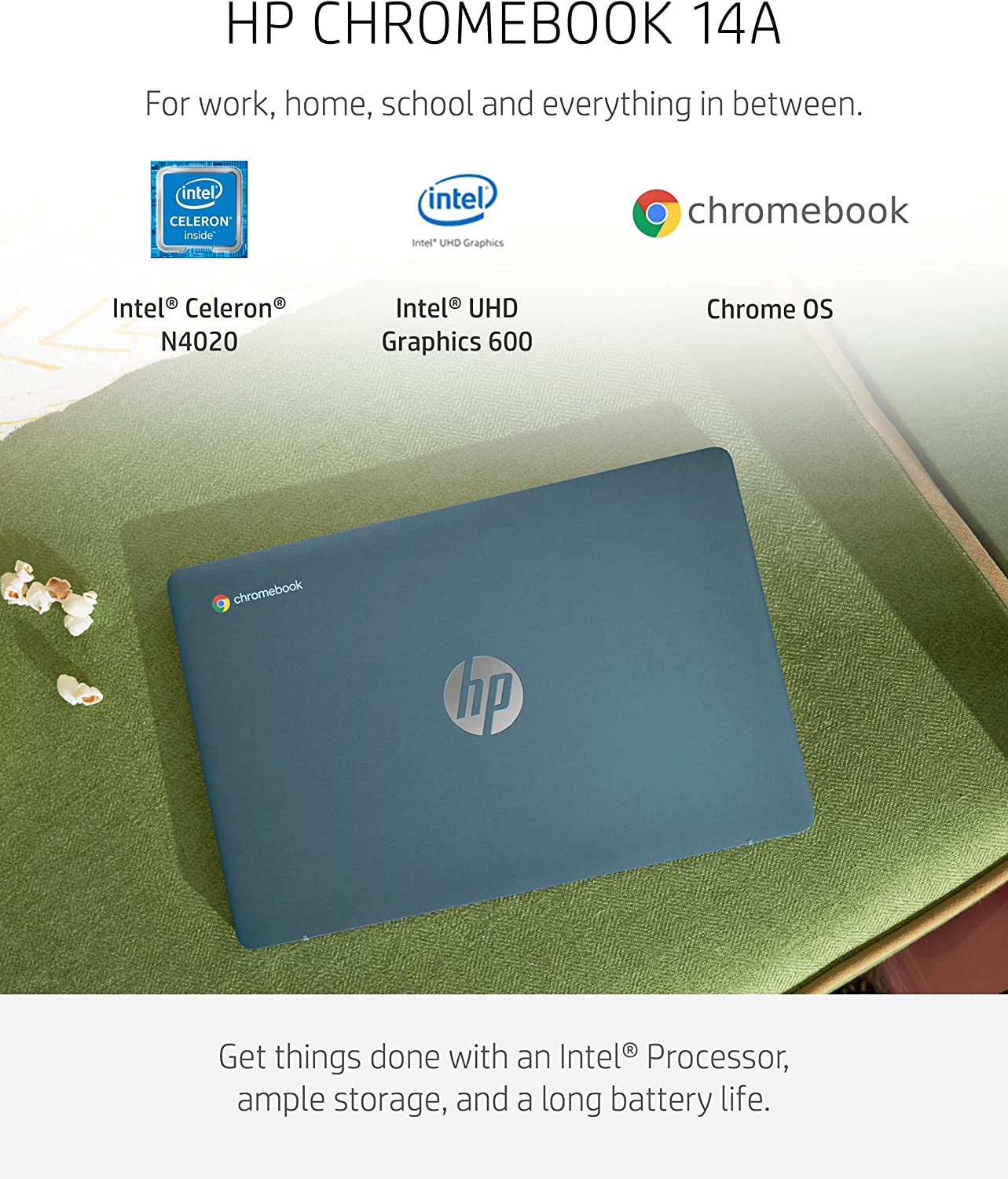 The HP Chromebook 14 Laptop empowers you to complete your tasks faster thanks to its responsive processor, ample storage, and apps for everything. With its 14-inch HD (1366 x 768), micro-edge, BrightView display (1), images appear more immersive than ever before. An Intel® Celeron processor (2) and visuals powered by UHD Graphics 600 (3), empowers you to complete your work seamlessly; then, kick back and relax while binge watching all your favorite shows. Storing assignments, presentations, and homework is hassle-free with 32 GB eMMC (4) storage; accessing your files is even faster with the laptop’s 4 GB of RAM. Plus, you can enjoy front-row-quality entertainment longer thanks to the computer’s long battery life of up to 14 hours with mixed usage (5). The Chrome operating system benefits from Google’s continually improved security measures, allowing your work to stay protected while you navigate through the web. Video chatting with colleagues, friends, and family becomes crystal-clear with the help of the HP Wide Vision 720p HD camera and integrated dual-array digital microphones (6). The included Wi-Fi 5 (2x2) and Bluetooth® 5.0 combo (7) allows your Chromebook 14 to maintain its rock solid internet connections. With its intuitive touchscreen, the 14-inch computer allows you to zoom, pinch, and swipe your content right from the screen (1) for enhanced productivity. The Chromebook laptop meets the criteria for energy efficiency, as well. HP’s 14” Chromebook is ENERGY STAR® certified (8) and EPEAT® Silver registered (9), making it safe for the environment. (1) High-definition (HD) content is required to view high definition images. (2) Multi-core is designed to improve performance of certain software products. Not all customers or software applications will necessarily benefit from use of this technology. (3) Shared video memory (UMA) uses part of the total system memory for video performance. System memory dedicated to video performance is not available for other use by other programs. (4) For storage drives, GB = 1 billion bytes. Actual formatted capacity is less. Portion of internal system storage is reserved and not user accessible. (5)Testing conducted by HP using Google Chrome OS power LoadTest. Battery life will vary and the maximum capacity of the battery will naturally decrease with time and usage. See chromium.org/chromium-os/testing/power-testing for test details. (6) Features may require software or other 3rd party applications to provide the described functionality. Internet service required and not included. (7) Wireless access point and internet service required and sold separately. Availability of public wireless access points limited. Wi-Fi 5 (802.11ac) is backwards compatible with prior Wi-Fi 5 specs.Bluetooth® is a trademark owned by its proprietor and used by Hewlett-Packard Company under license. (8) ENERGY STAR and the ENERGY STAR mark are registered trademarks owned by the U.S. Environmental Protection Agency. (9) Based on U.S. EPEAT® registration according to IEEE 1680.1-2018 EPEAT®. EPEAT® status varies by country. Visit www.epeat.net for more information.