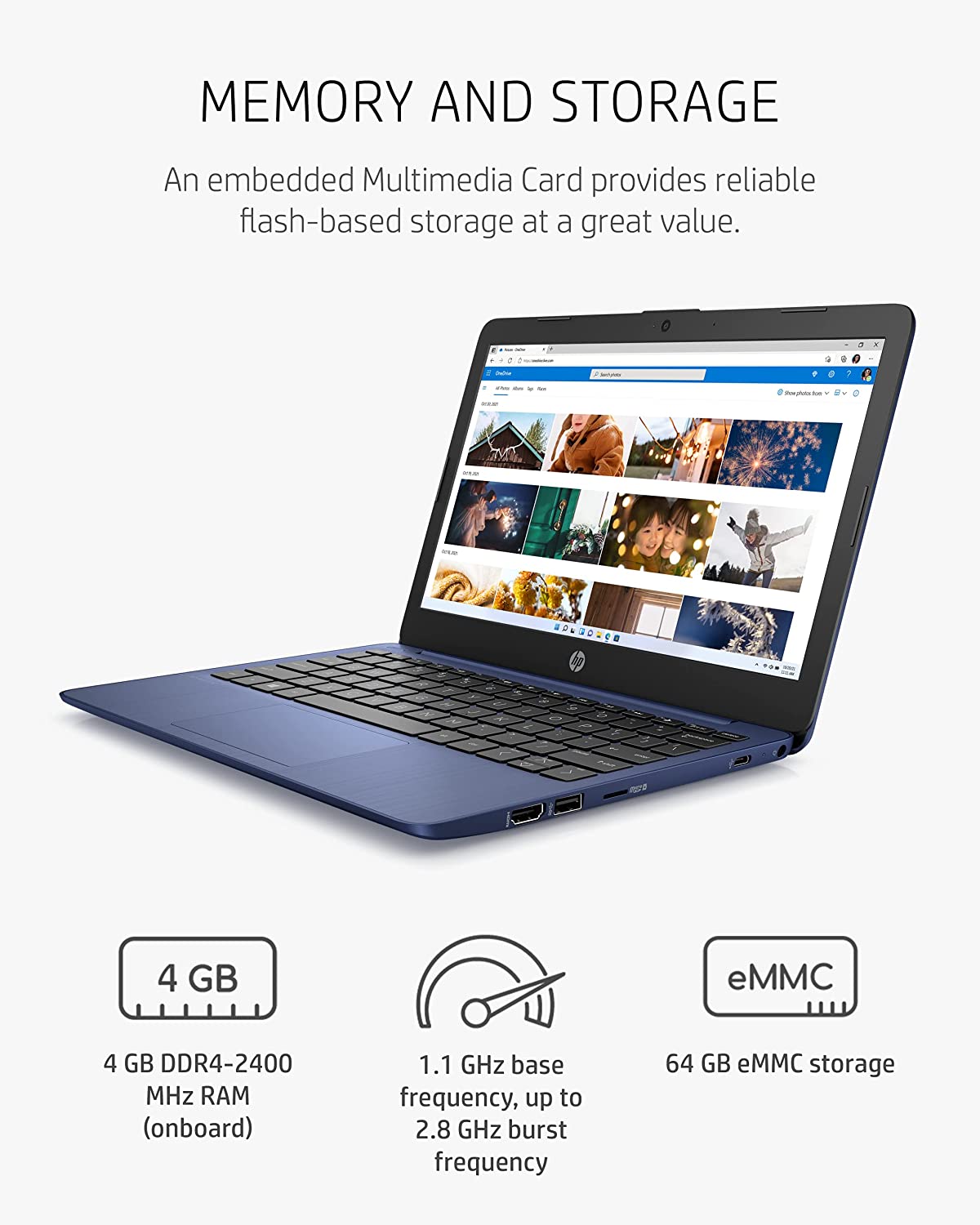 Live your best life on the go and in style with the slim and expressive HP Stream 11 Laptop. With its smooth finish, vertical brushed pattern, and pop of Royal Blue color, this windows laptop perfectly fits your personality. The design isn't only for looks; the ultra-thin laptop is super portable and its high-definition display contains an anti-glare panel—perfect for travel and computing out in the sun (1). This affordable HP laptop features powerful and reliable hardware, such as the dual-core Intel® Celeron® N4020 processor (2) and Intel® UHD Graphics 600 (3). Plus, with an embedded Multimedia Card, you’ll enjoy 64 GB of storage for greater content security, fewer moving parts, and at a great value (4). Additionally, experience a boost to your 11.6-inch laptop’s overall performance and bandwidth thanks to 4 GB of RAM. And with up to 13 hours and 15 minutes of battery life, you’ll enjoy all that processing power and storage options from the start of your workday to the end of your evening streaming (5). Experience quicker boot-ups and strong protection against phishing and malware with the Windows 11 Home in S Mode (6). Plus, your device's 1-year limited hardware warranty provides even more peace of mind. Whether you’re at home, the office, or in class, the dependable Realtek RTL8822CE 802.11a/b/g/n/ac (2x2) Wi-Fi® (7) and Bluetooth® 5.0 (8) combo is just the solution for preventing unwanted connection drops or waiting on endless load screens. Take advantage of a free 1-year subscription to Microsoft 365 and utilize the many new smart assistance tools and other creativity promoting features this HP laptop computer has to offer (9). Stay productive anywhere while shrinking your carbon footprint with a PC laptop that's not only built with sustainability in mind, but is also ENERGY STAR® certified (10) and EPEAT® Silver registered (11). (1) High-definition (HD) content is required to view high-definition images. (2) Multi-core is designed to improve the performance of certain software products. Not all customers or software applications will necessarily benefit from the use of this technology. Performance and clock frequency will vary depending on application workload and your hardware and software configurations. Intel’s numbering, branding, and/or naming is not a measurement of higher performance. Intel, Pentium, Intel Core, Celeron, Iris Xe, Intel logo, and the Intel Inside logo are trademarks of Intel Corporation in the U.S. and other countries. (3) Shared video memory (UMA) uses part of the total system memory for video performance. System memory dedicated to video performance is not available for other use by other programs. (4) For storage drives, GB = 1 billion bytes. The actual formatted capacity is less. Up to 5.1GB of disk is reserved for system recovery software. (5) Battery life tested by HP using continuous FHD video playback, 1080p (1920x1080) resolution, 150 nits brightness, system audio level at 17%, player audio level at 100%, played full-screen from local storage, headphone attached, wireless on but not connected. Actual battery life will vary depending on configuration and maximum capacity will naturally decrease with time and usage. (6) Not all features are available in all editions or versions of Windows. Systems may require upgraded and/or separately purchased hardware, drivers, software, or BIOS update to take full advantage of Windows functionality. Windows 11 is automatically updated, which is always enabled. ISP fees may apply and additional requirements may apply over time for updates. See http://www.windows.com. Windows 11 in S mode works exclusively with apps from the Microsoft Store within Windows. Certain default settings, features, and apps cannot be changed. Some accessories and apps compatible with Windows 11 may not work (including some antivirus, PDF Writers, driver utilities, and accessibility apps) and performance may vary, even if you switch out of S mode. If you switch to Windows 11, you can’t switch back to S mode. Learn more at Windows.com/SmodeFAQ. (7) Wireless access point and internet service required and sold separately. The availability of public wireless access points is limited. Wi-Fi 5 (802.11ac) is backward compatible with prior Wi-Fi 5 specs. (8) Bluetooth® is a trademark owned by its proprietor and used by HP Inc. under license. (9) Microsoft 365 Personal 1-year subscription included. Activation is required within 180 days of the Windows activation date. Microsoft 365 Family and Microsoft 365 Personal have non-commercial rights and are meant for personal use only. See microsoft.com for full details. (10) ENERGY STAR and the ENERGY STAR mark are registered trademarks owned by the U.S. Environmental Protection Agency. (11) Based on U.S. EPEAT® registration according to IEEE 1680.1-2018 EPEAT®. EPEAT® status varies by country. Visit www.epeat.net for more information.
