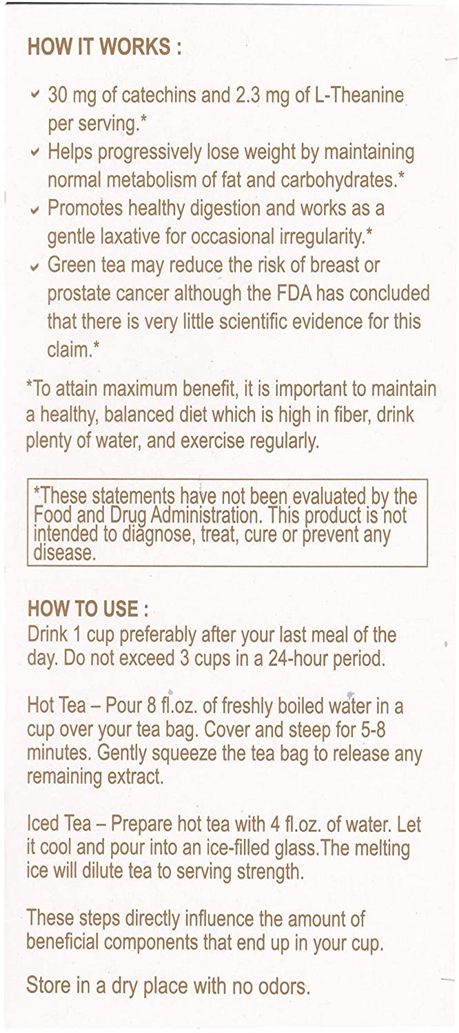 Hyleys Slim Tea 5 Flavor Assortment (25 teabags in foil envelopes). HOW TO USE: Drink 1 cup preferably after your last meal of the day. Do not exceed 3 cups in a 24 hour period.