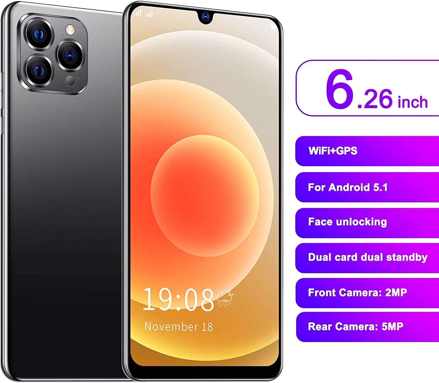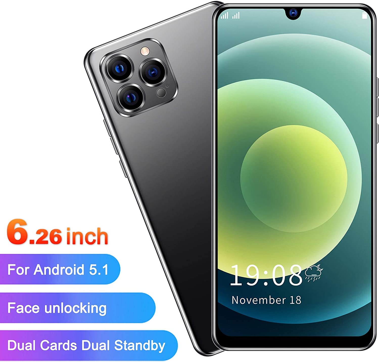 IP12 PRO Unlocked Android Smartphone ,6.26in Waterdrop Full Screen Dual SIM Cell Phone ,Ultra Thin Mobile Phone Supports Face Fingerprint Unlocking ,Quad Core CPU ,Triple Rear Camera Black