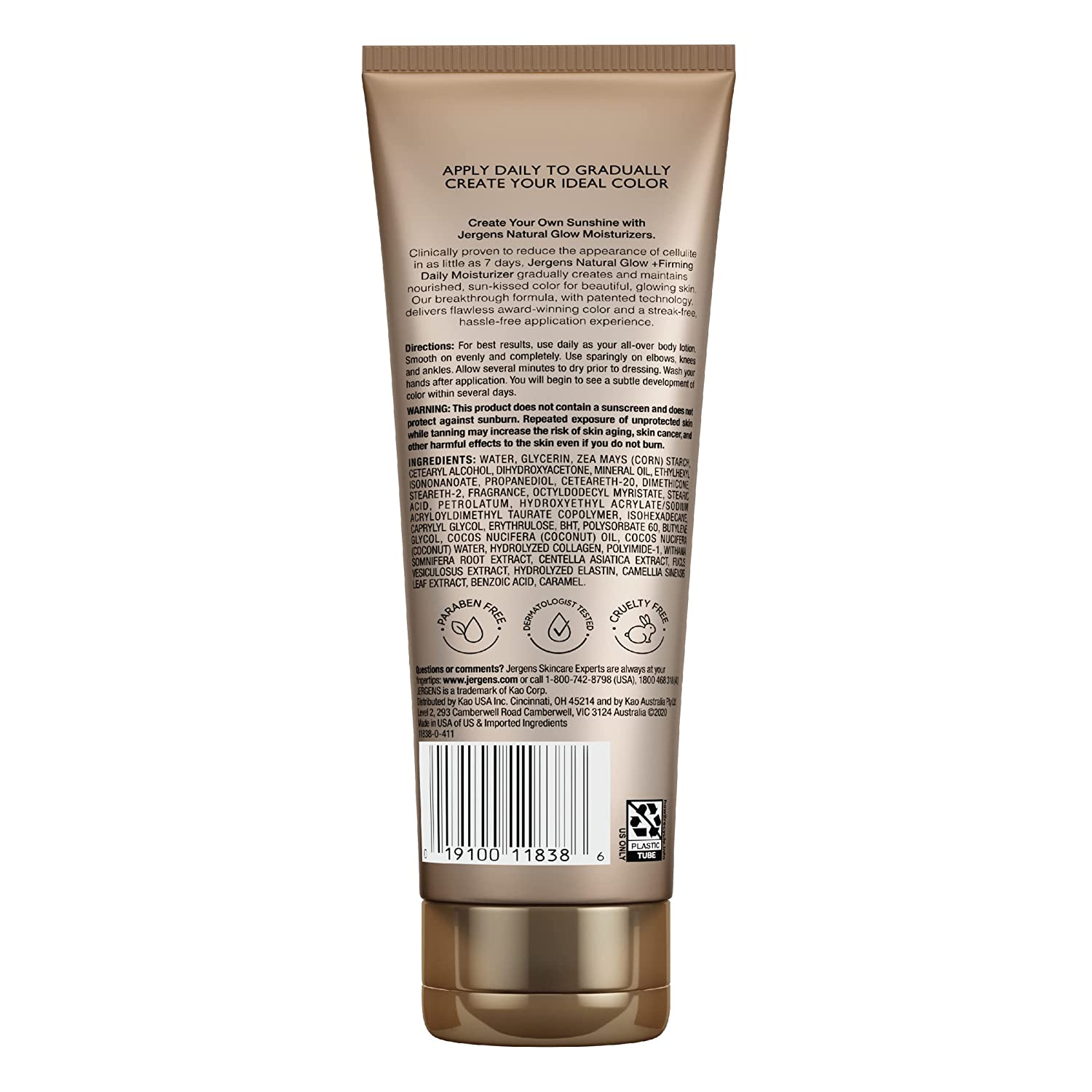 Applying this self tanning daily body lotion can achieve a flawless, natural looking glow and help reduce the appearance of cellulite. Jergens Natural Glow +FIRMING Daily Moisturizer for Fair to Medium, lighter, fairer skin, gradually delivers subtle, streak-free color and reduces the appearance of cellulite in as little as 7 days. To enhance your natural skin tone, apply in place of your regular body moisturizer at least once daily and you'll have beautiful, natural looking color in about one week for fair skin tones. Jergens Natural Glow +FIRMING Daily Moisturizer for fair to medium skin tones improves the look of cellulite. Anti cellulite cream visibly reduces cellulite on lighter skin tones. Collagen moisturizer tightens skin and improves elasticity for optimal skin health and moisture. It is infused with a blend of collagen, elastin and polymers and spreads over skin to give it a smoother look. Satisfaction Guaranteed. Limitations may apply.