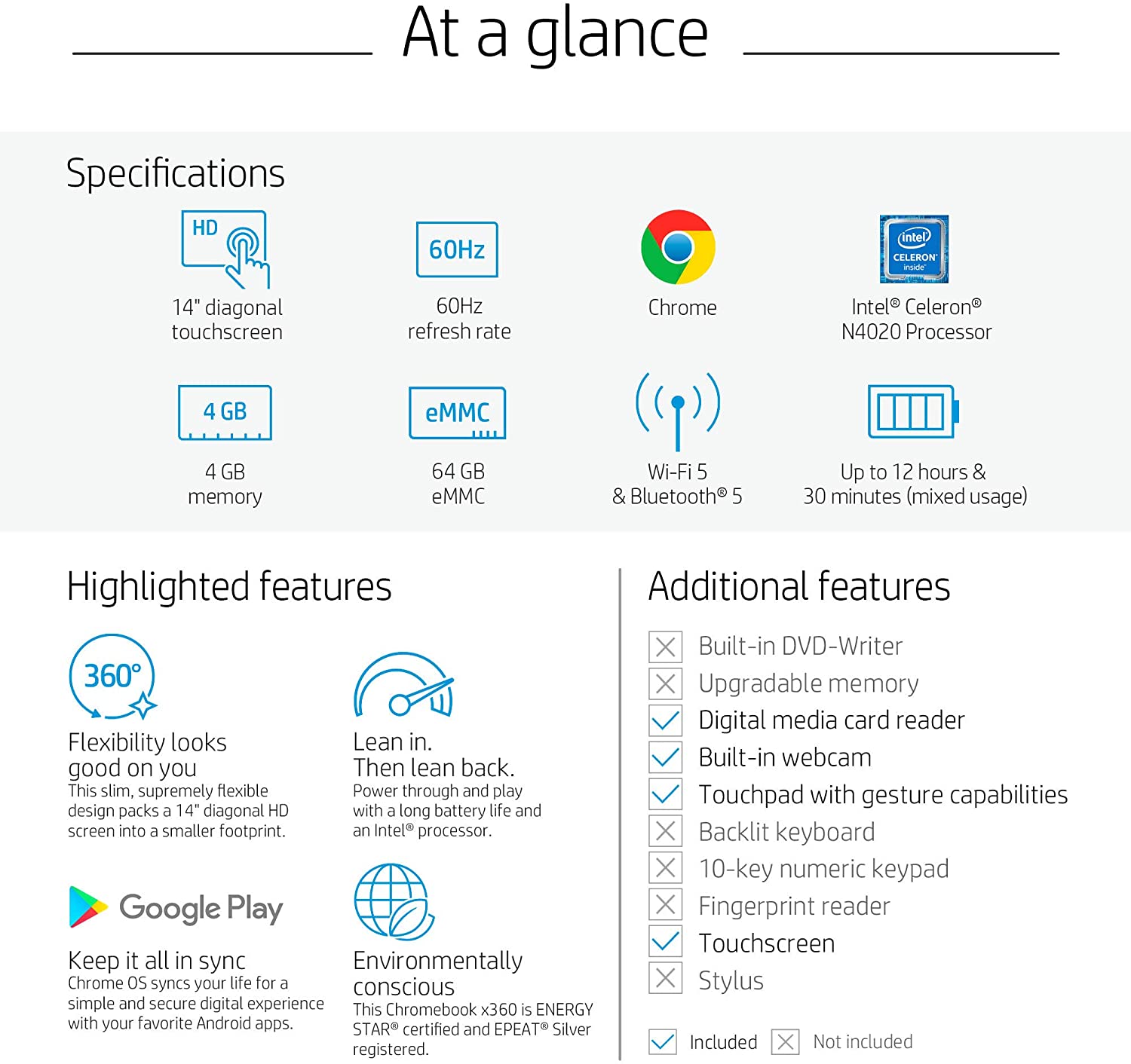 Laptop HP X360 14a Chromebook 14" HD Touchscreen, Entertaining from Any Angle Intel Celeron, 4GB DDR4 64GB eMMC WiFi Webcam Stereo Speakers Bluetooth 4.2 Chrome Blue Metallic Color