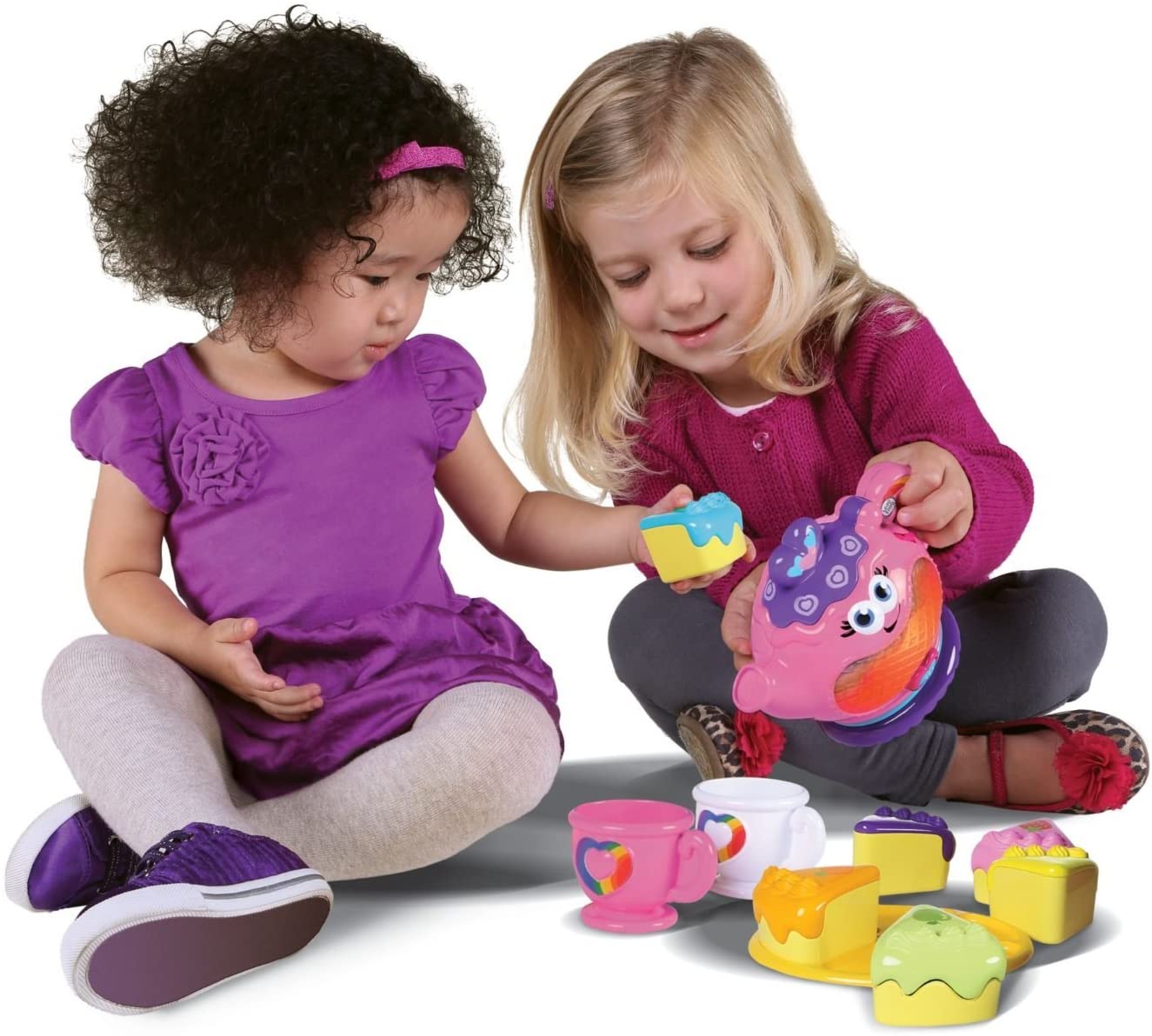 Attend a tea party with a magical twist with the LeapFrog Musical Rainbow Tea Party, a 10-piece tea party set designed especially for preschool-age children. Turn the tea time play ritual into an inspiring activity with this colorful set which features a magical teapot that lights up in six rainbow colors and plays fun learning songs! Explore preschool skill-building activities like early vocabulary and counting, while developing social skills like sharing, taking turns, manners and more. The Musical Rainbow Tea Party features 50+ songs, phrases and tea party sounds. Appropriate for children ages 1-3 years.