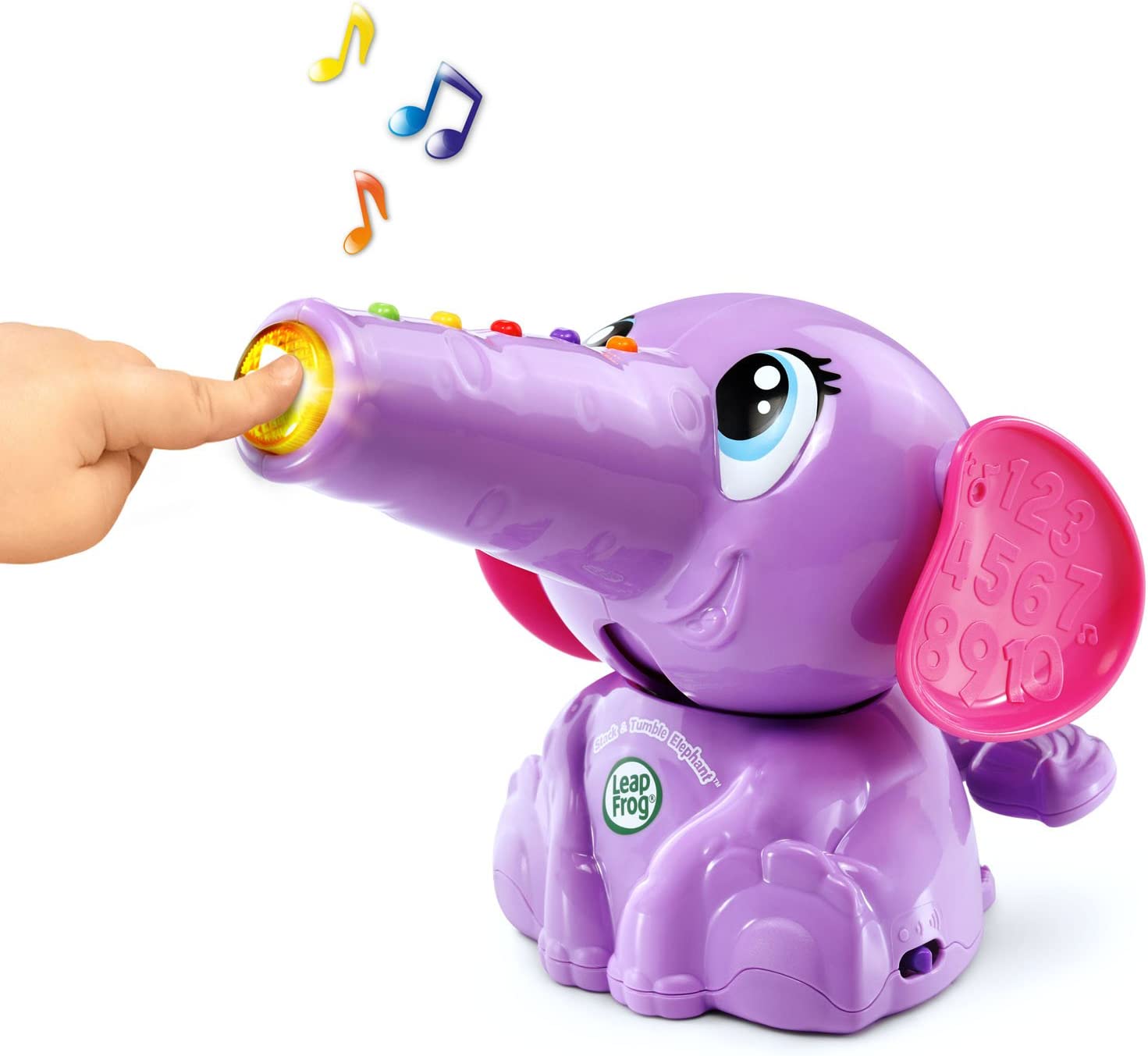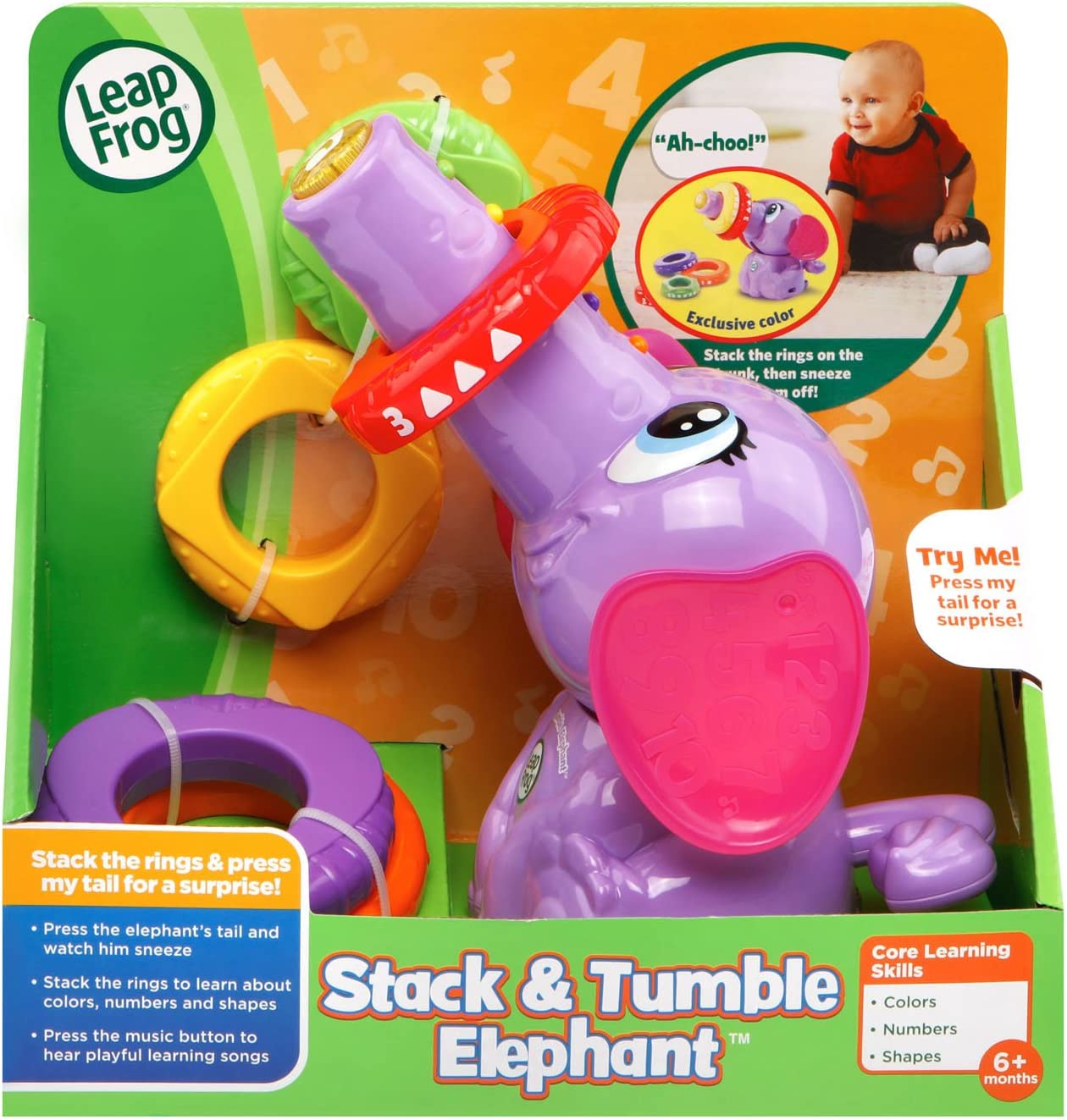 Stacking is tons of fun with the online exclusive purple stack and tumble elephant. Stack the five brightly colored, textured rings on the elephant's trunk. As each ring is placed on the trunk, she will introduce colors, numbers and or shapes. Press the music note button on the elephant's trunk to hear playful songs. Push down on her tail and watch her sneeze, sending the rings tumbling off her trunk. Then play again!