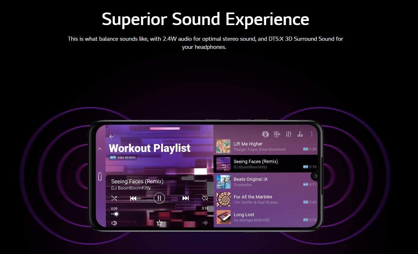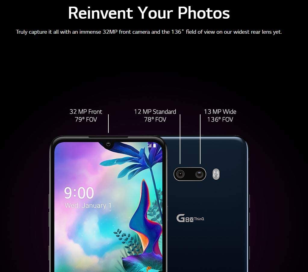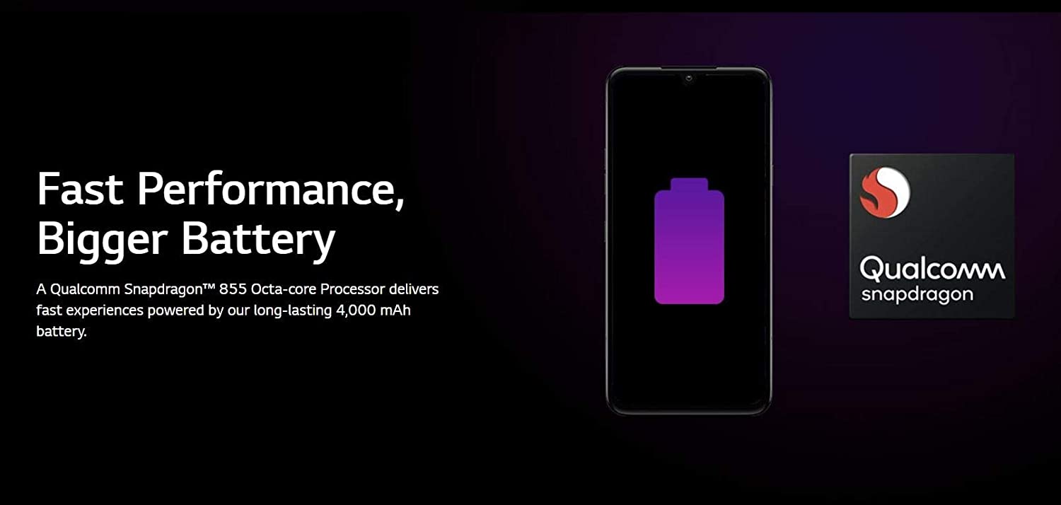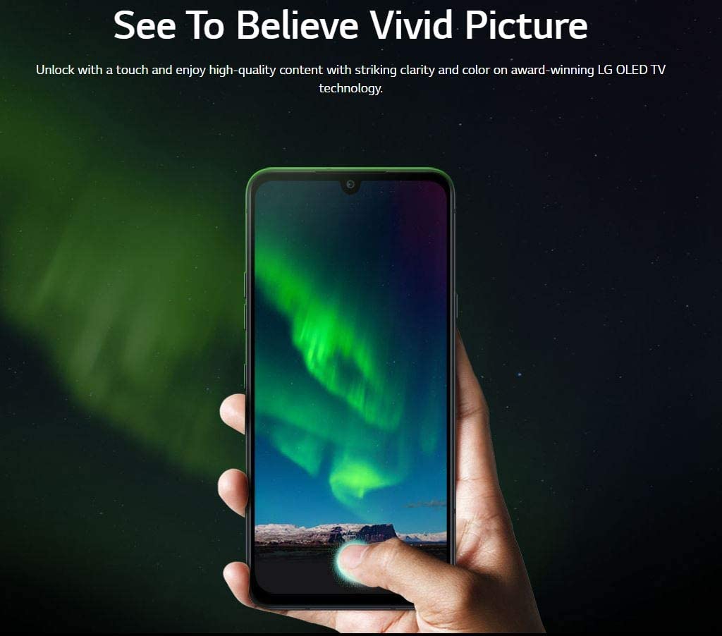 See To Believe Vivid PictureUnlock with a touch and enjoy high-quality content with striking clarity and color on award-winning LG OLED TV technology. Reinvent Your PhotosTruly capture it all with an immense 32MP front camera and the 136˚ field of view on our widest rear lens yet. Striking Sleek DesignThis device is crafted with smooth, contoured glass and rounded corners for a modern aesthetic and a touch of elegance. Superior Sound ExperienceThis is what balance sounds like, with 2.4W audio for optimal stereo sound, and DTS:X 3D Surround Sound for your headphones. Capture Every WhisperCapture videos with refined sound and detail that tickle your senses and send tingles down your spine. Fast Performance, Bigger BatteryA Qualcomm Snapdragon 855 Octa-core Processor delivers fast experiences powered by our long-lasting 4,000 mAh battery.
